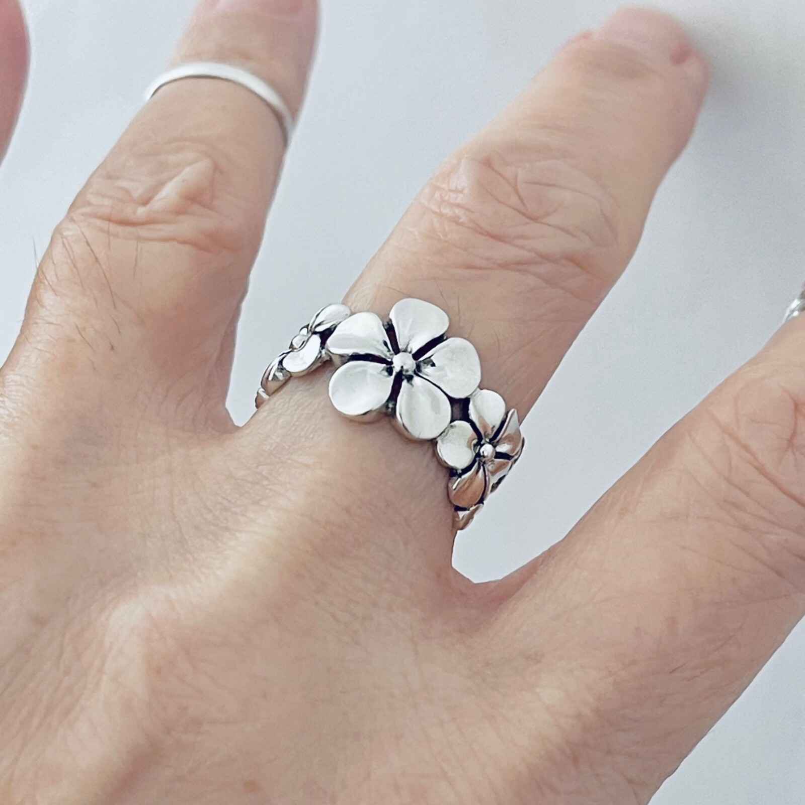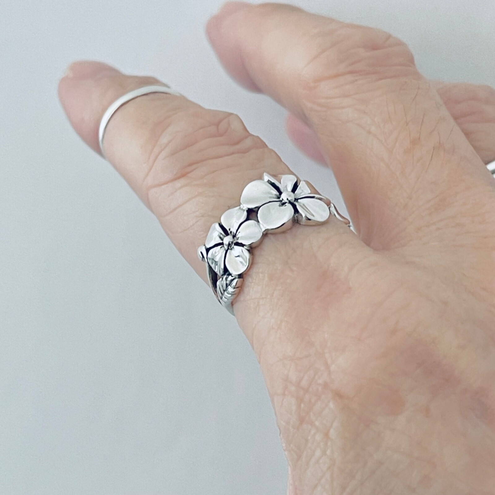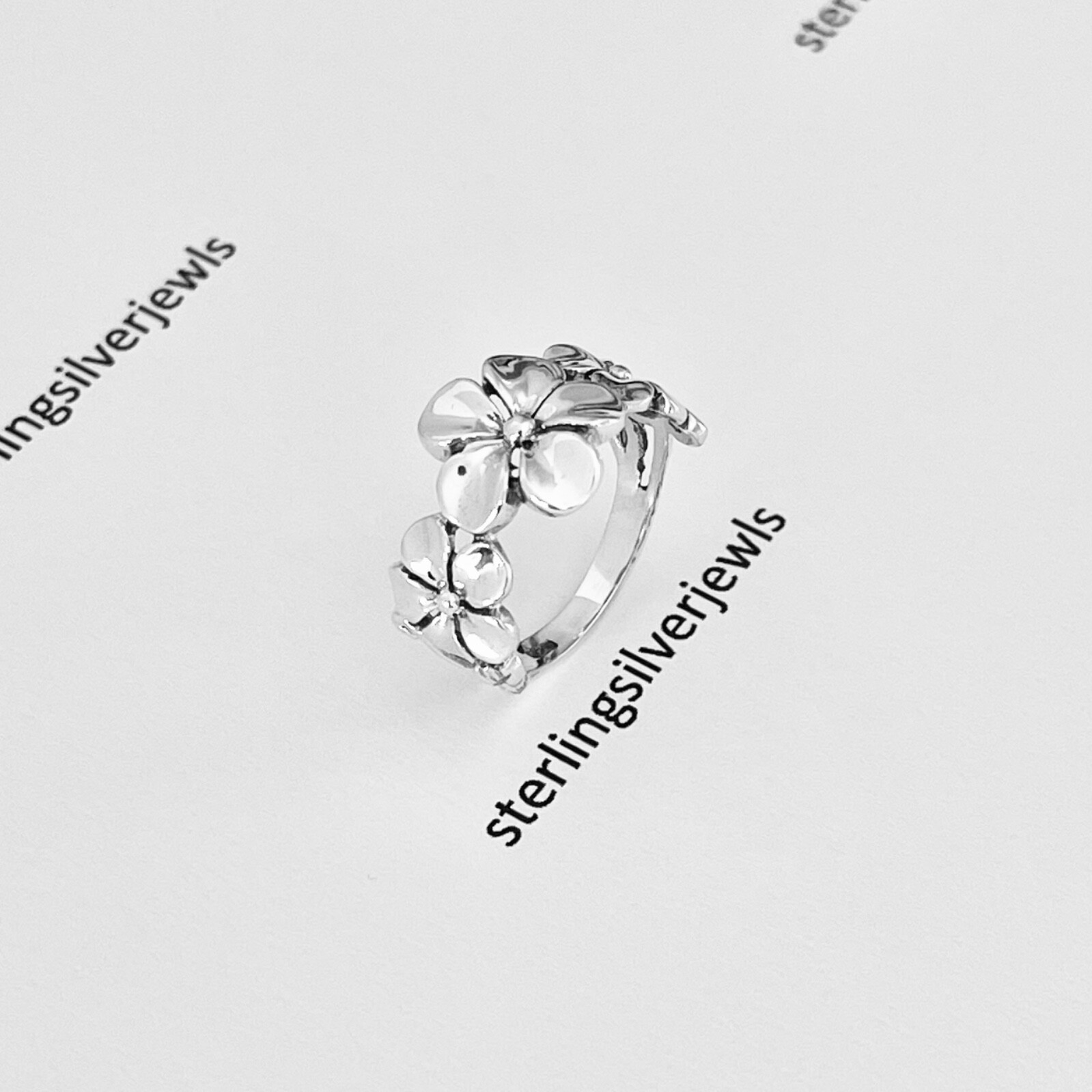 Sterling Silver 3 Plumeria Ring with Leaf, Lei Rings, Hawaii Flower Jewelry