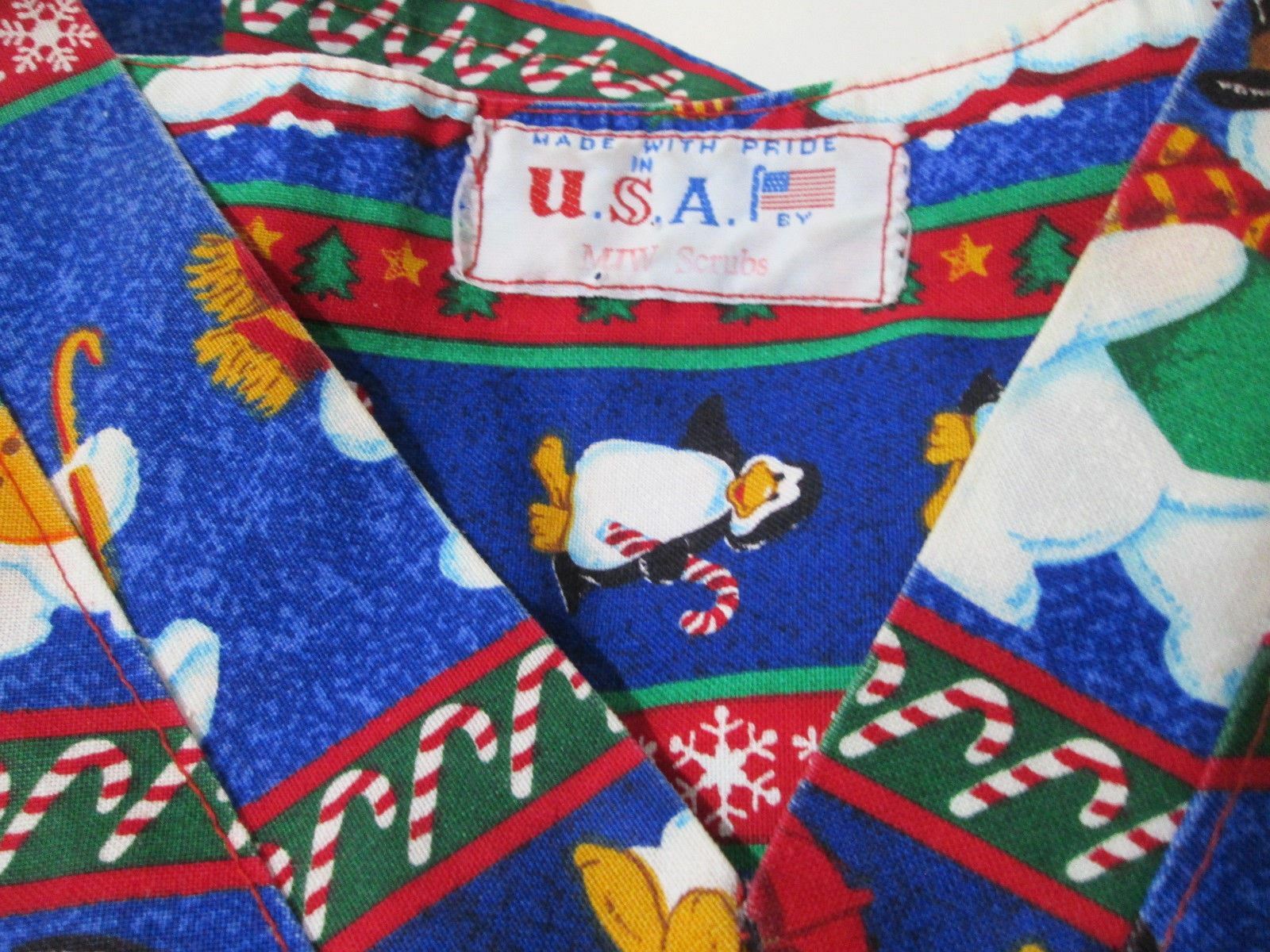 Snowman Penguins Scrub Top MJW Scrubs Size Large V Neck Short Sleeve
