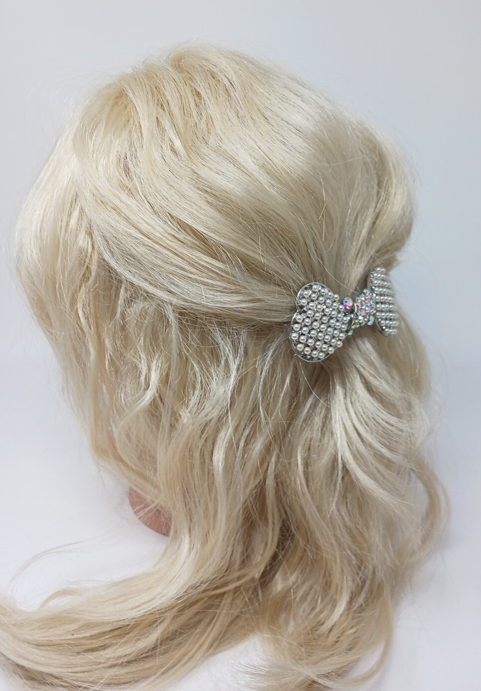 Womens Bow Hair Clip with Rhinestones and Pearls, Color Silver