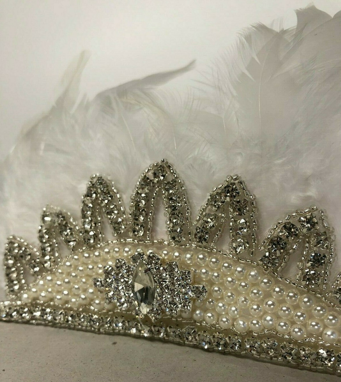 New Newborn Baby Photography Prop Girl Pearl Headband Jewels and Feathers White
