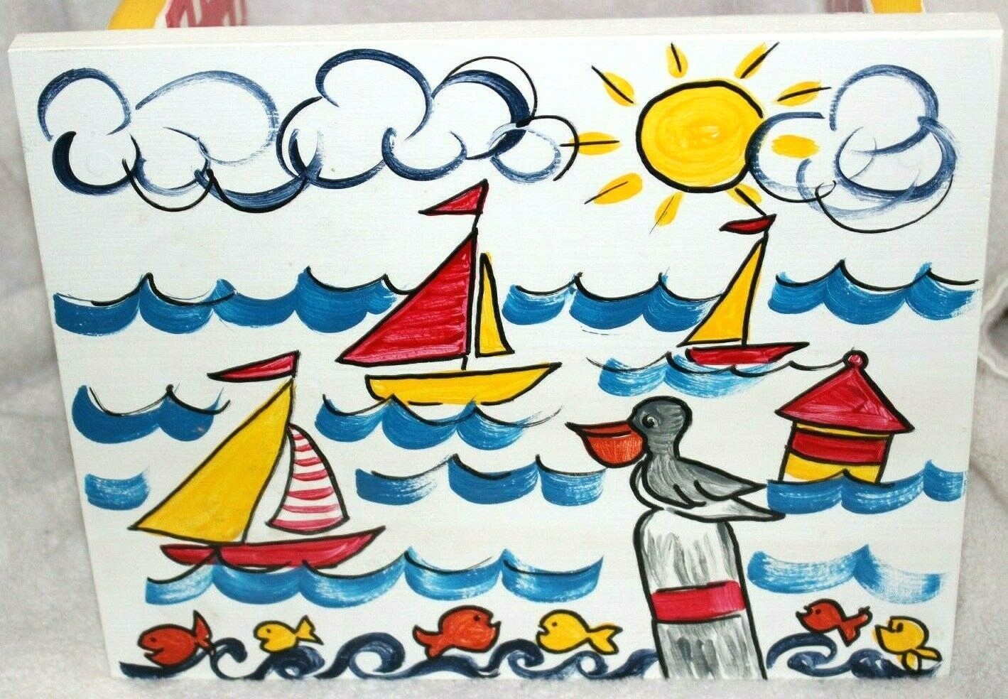 Handpainted Stool w/Sailboats on Water Fish Sun Clouds Seagull Scene 12x9.5x8.5