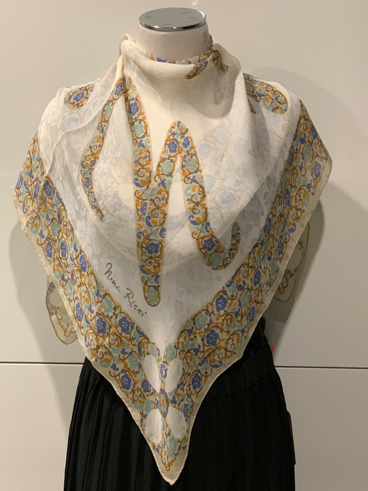 NINA RICCI PARIS Silk Jacquard Chiffon Floral Logo Scarf 82x82cm Handroll Hems