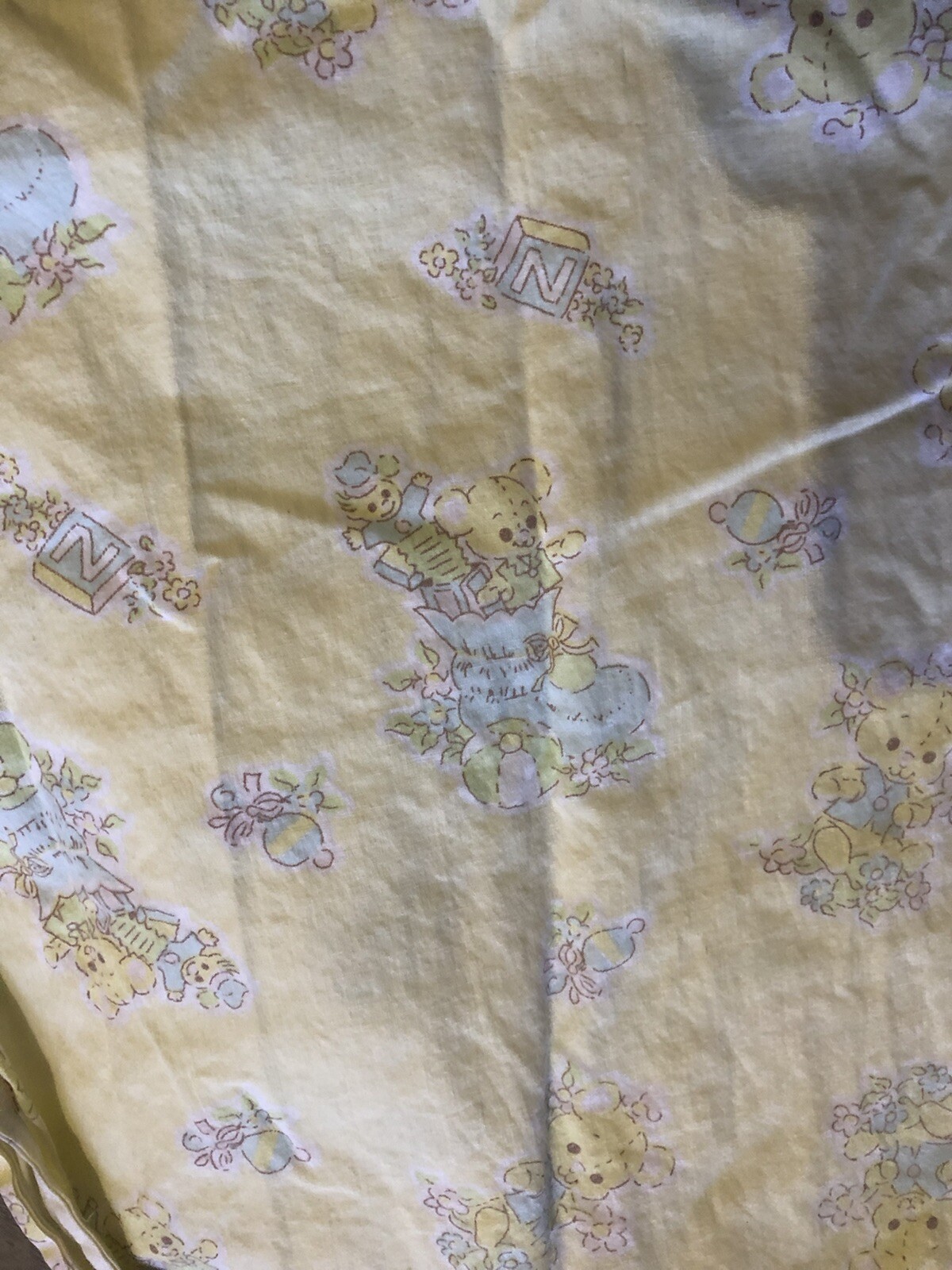 как выглядит Vintage Yellow Infant Baby Crib Fitted Sheet Fabric Teddy Bears Booties Toys фото