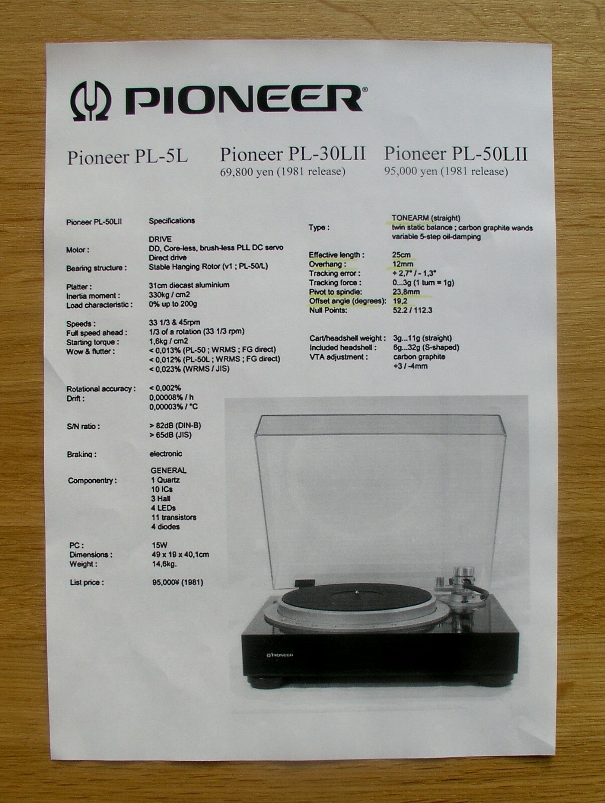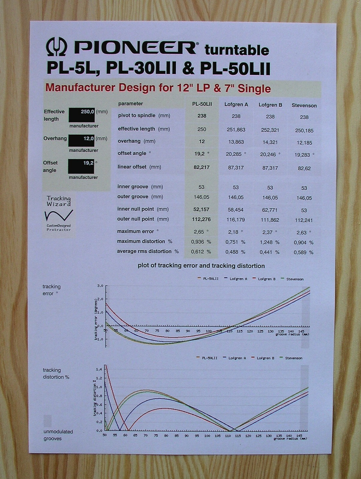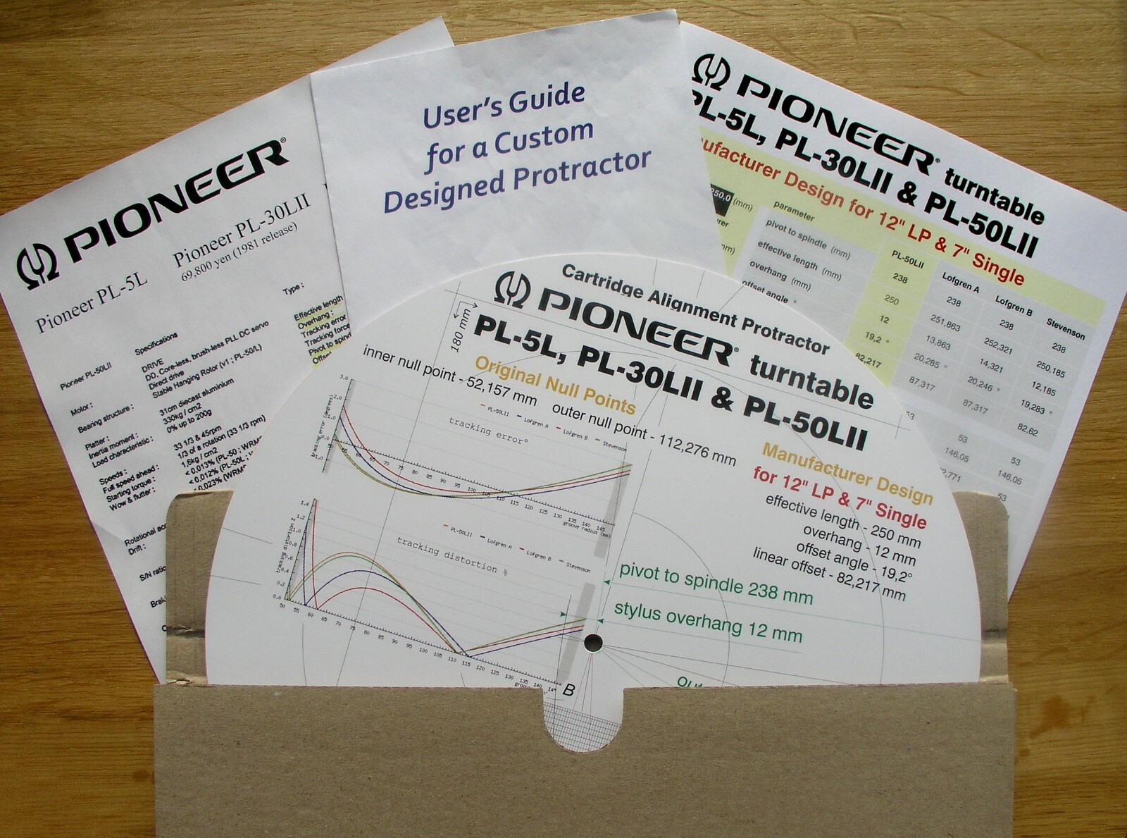 Pioneer PL-5L/30LII/50LII Tonearm Alignment Protractor Manufacturer Design