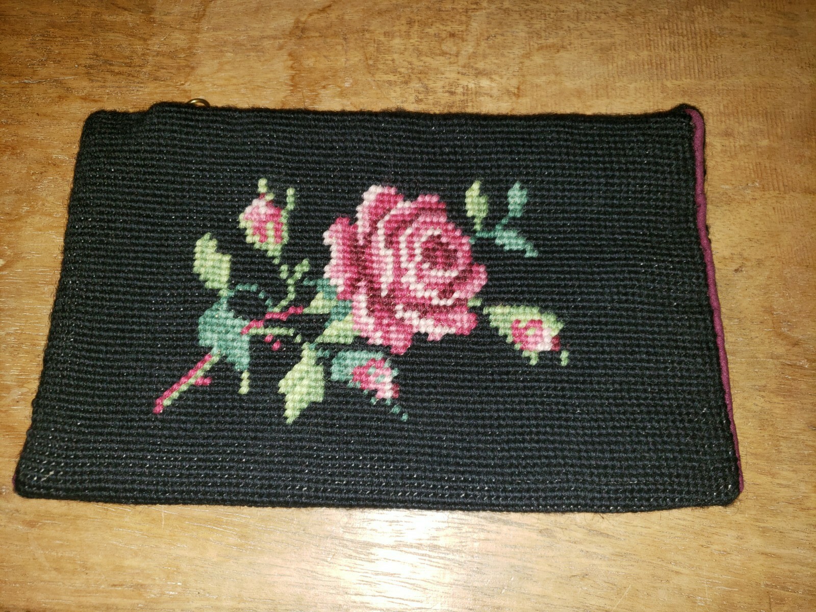 Vintage hooked wool tapestry floral clutch handbag black rose bag