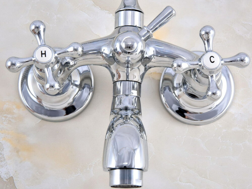 как выглядит Chrome Wall Mounted Double Handles Bathtub Tap With Brass Hand Shower Faucet фото