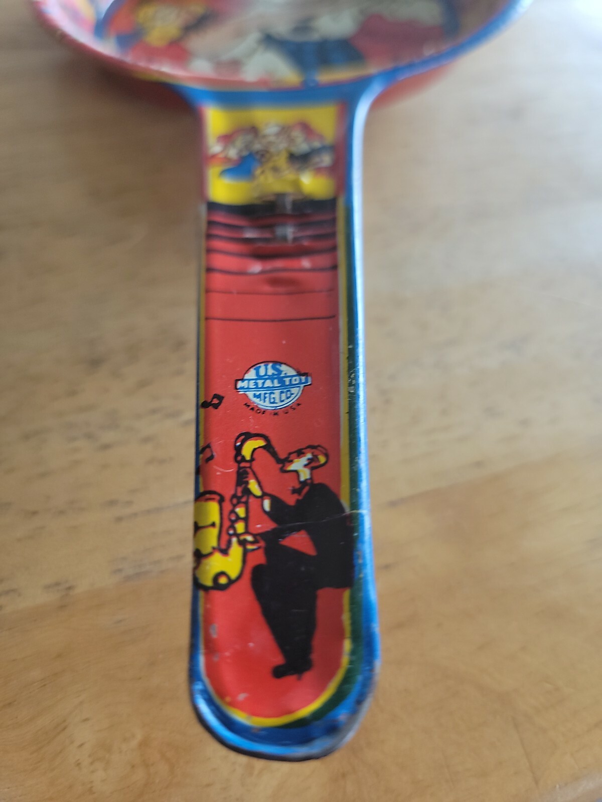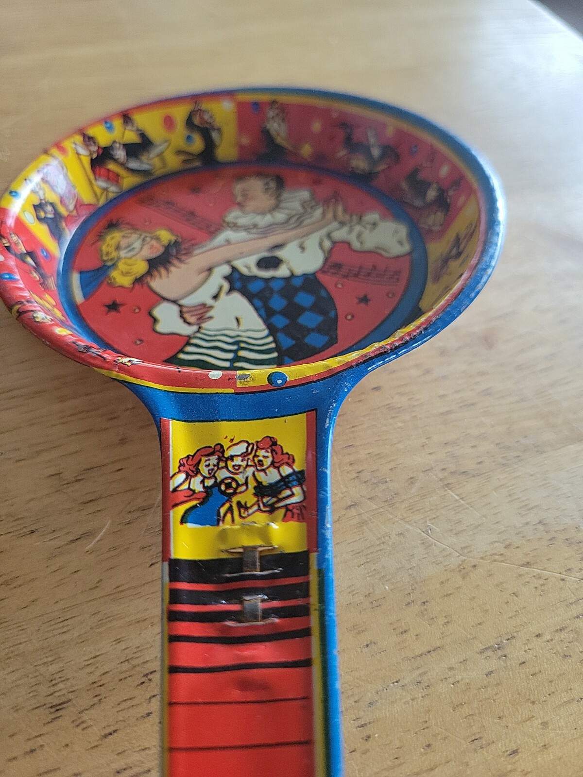 Vintage Tin Litho Noise Maker Paddle US Metal Toy Mfg Co Masquerade Couple Dance