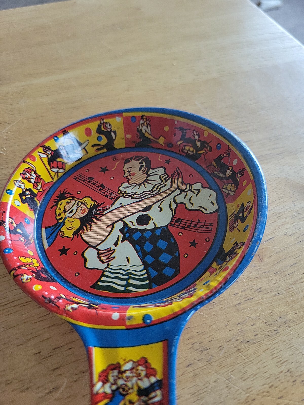 как выглядит Vintage Tin Litho Noise Maker Paddle US Metal Toy Mfg Co Masquerade Couple Dance фото