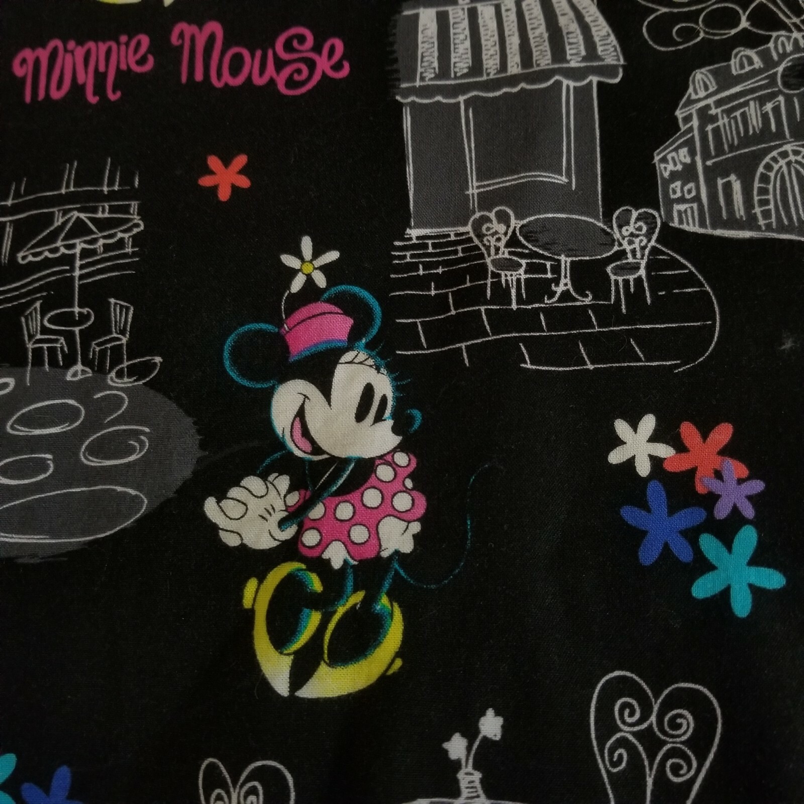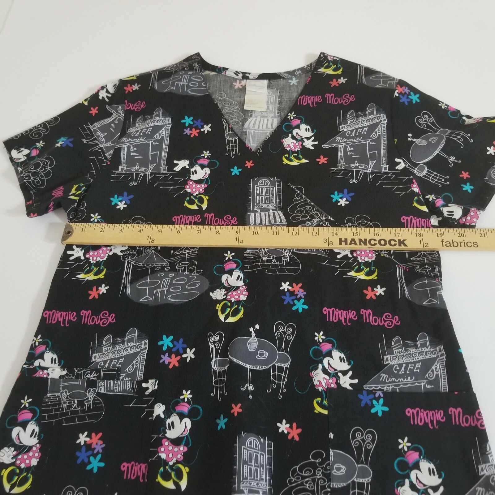Disney Minnie Mouse V Neck Scrub Top Colorful Medium Cafe Pullover Black Flowers