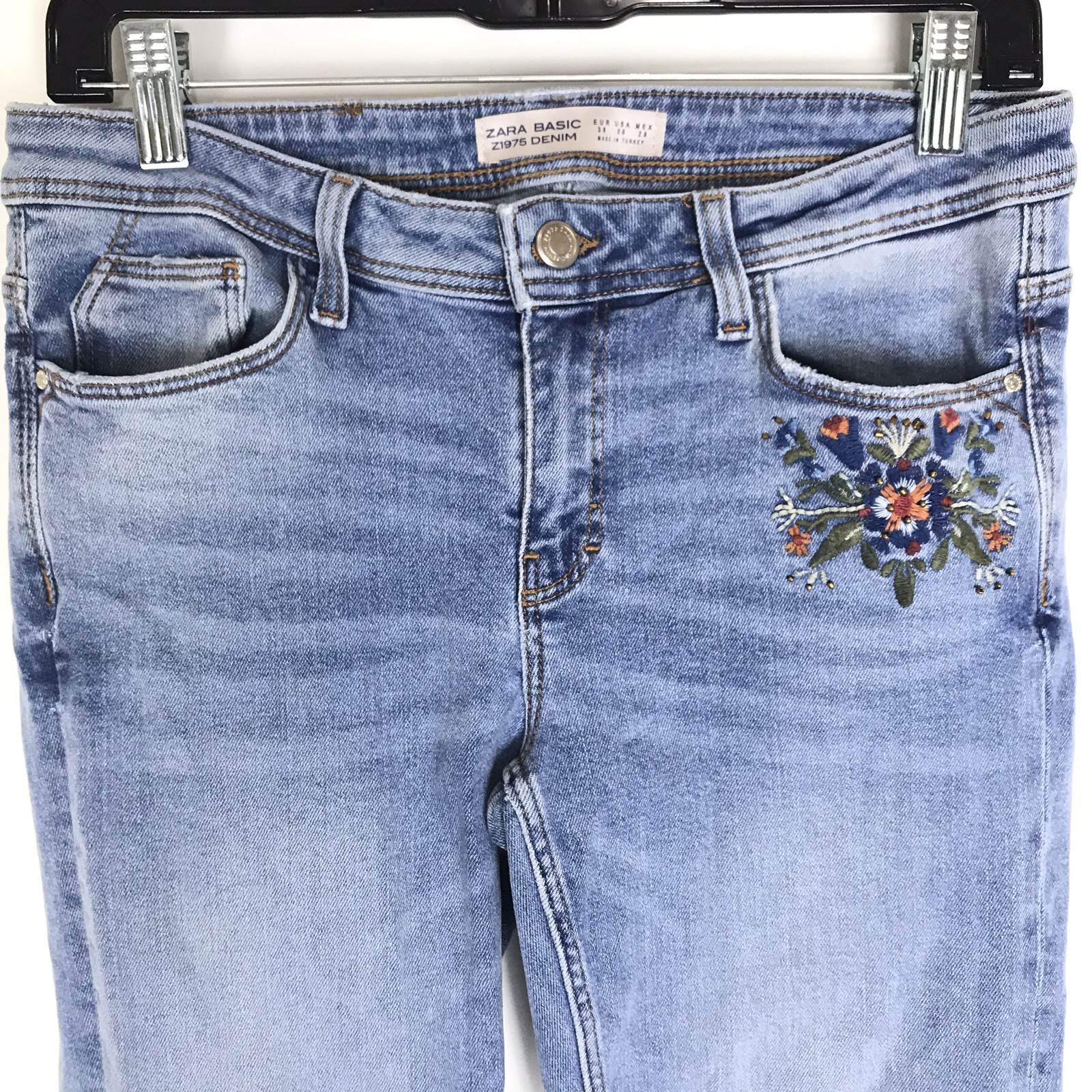 Zara Basic Z1975 Womens Denim Embroidered Jeans Floral Distressed NWOT Hem 38/6