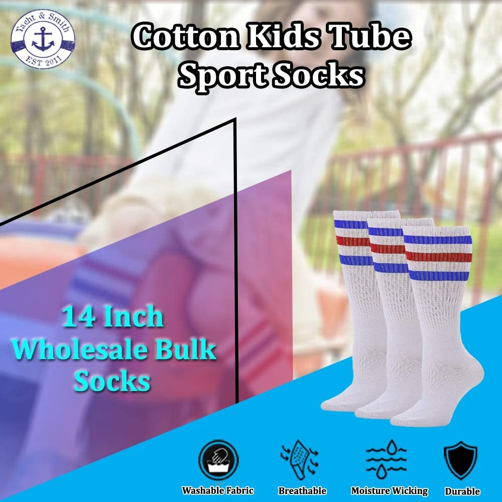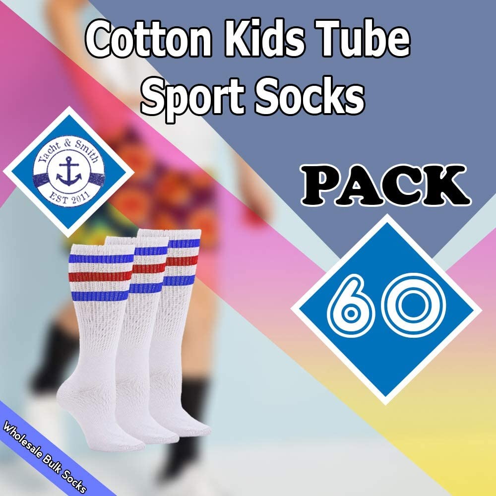 60 PK of Kids Cotton Tube Socks White With Stripes Size 4-6 - Boys Crew Sock