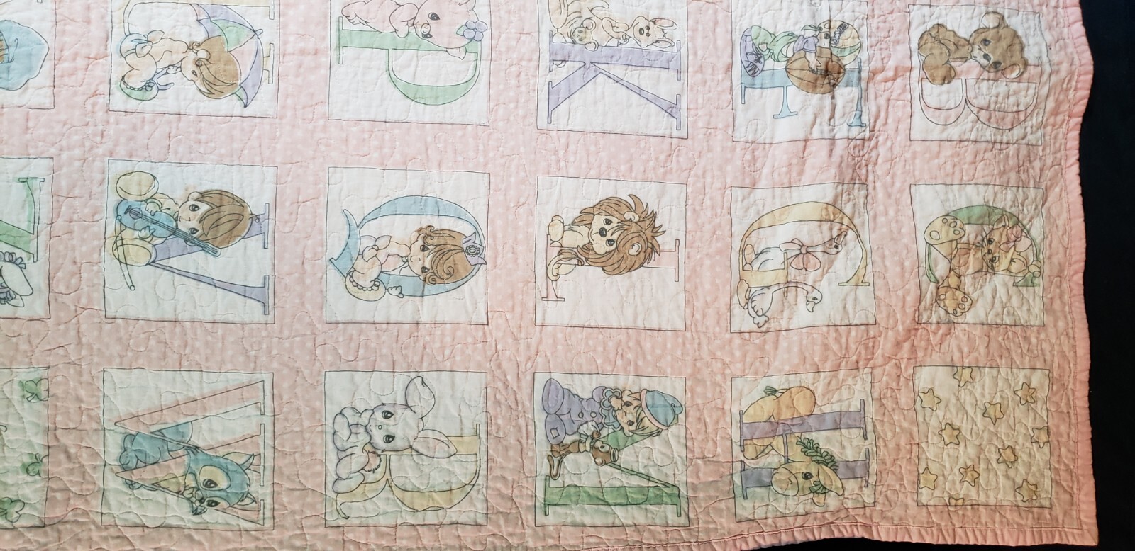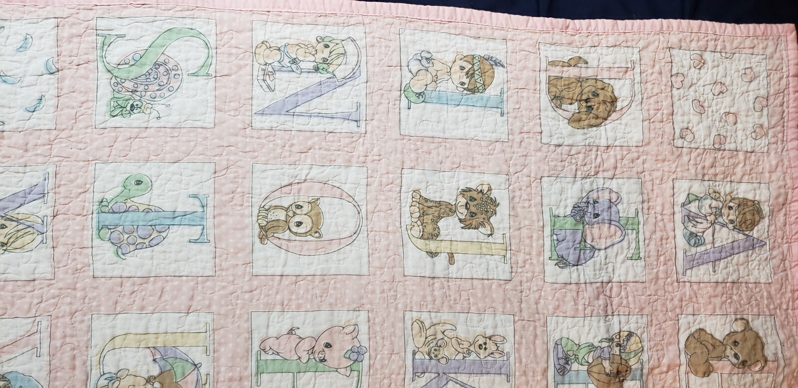 Handmade Pink Baby Quilted w/ ABC's/32 X 40/Baby Blanket/Solid Pink Backing/No