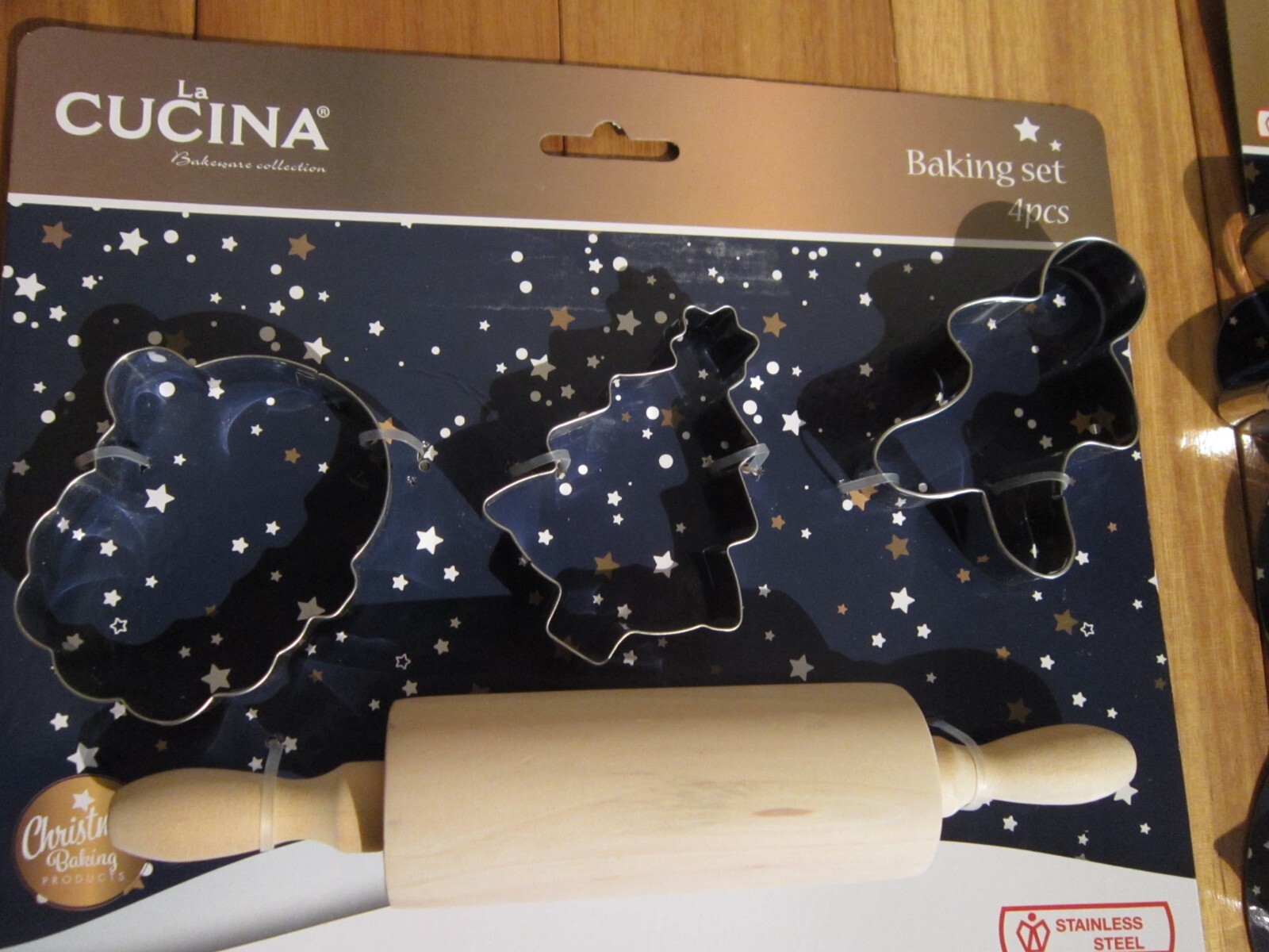 как выглядит LA CUCINA Kids Baking Set WOOD Rolling Pin 6 Cookie Cutters SNOWMAN,  T13 фото