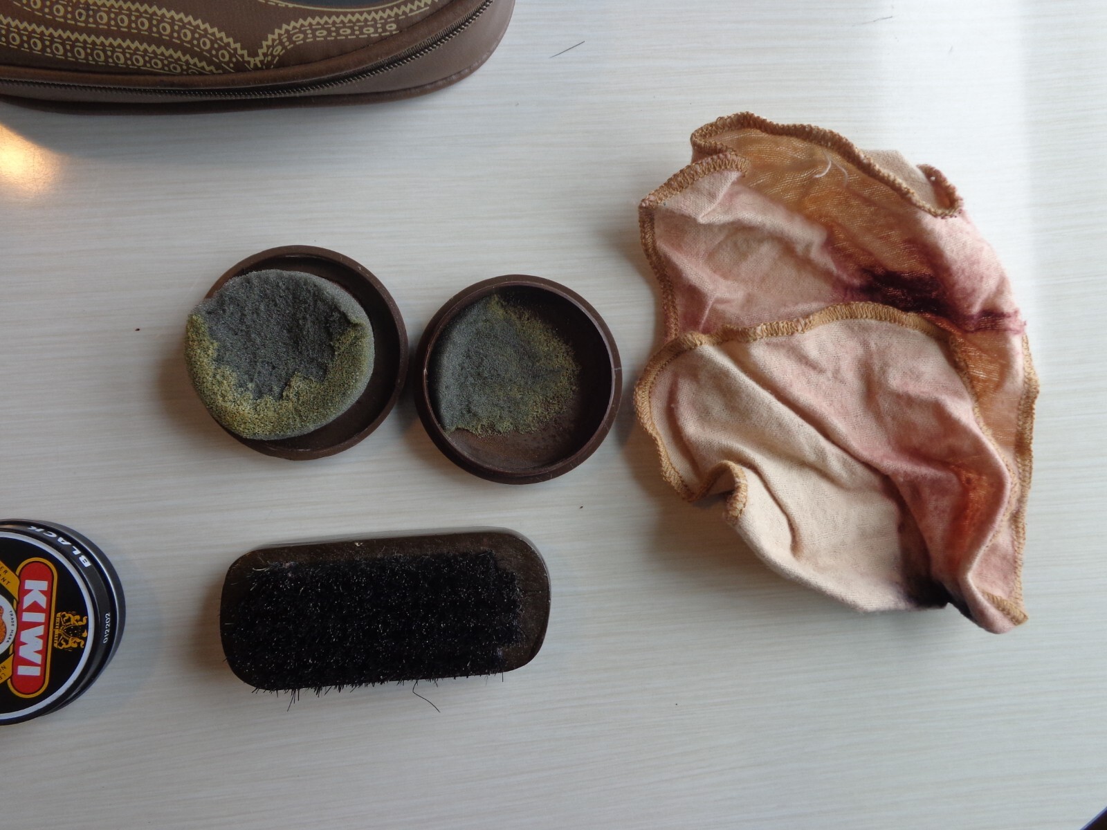 как выглядит Vintage Shoe Shape Zippered Shoe Shine Kit w/brush tins cloth фото