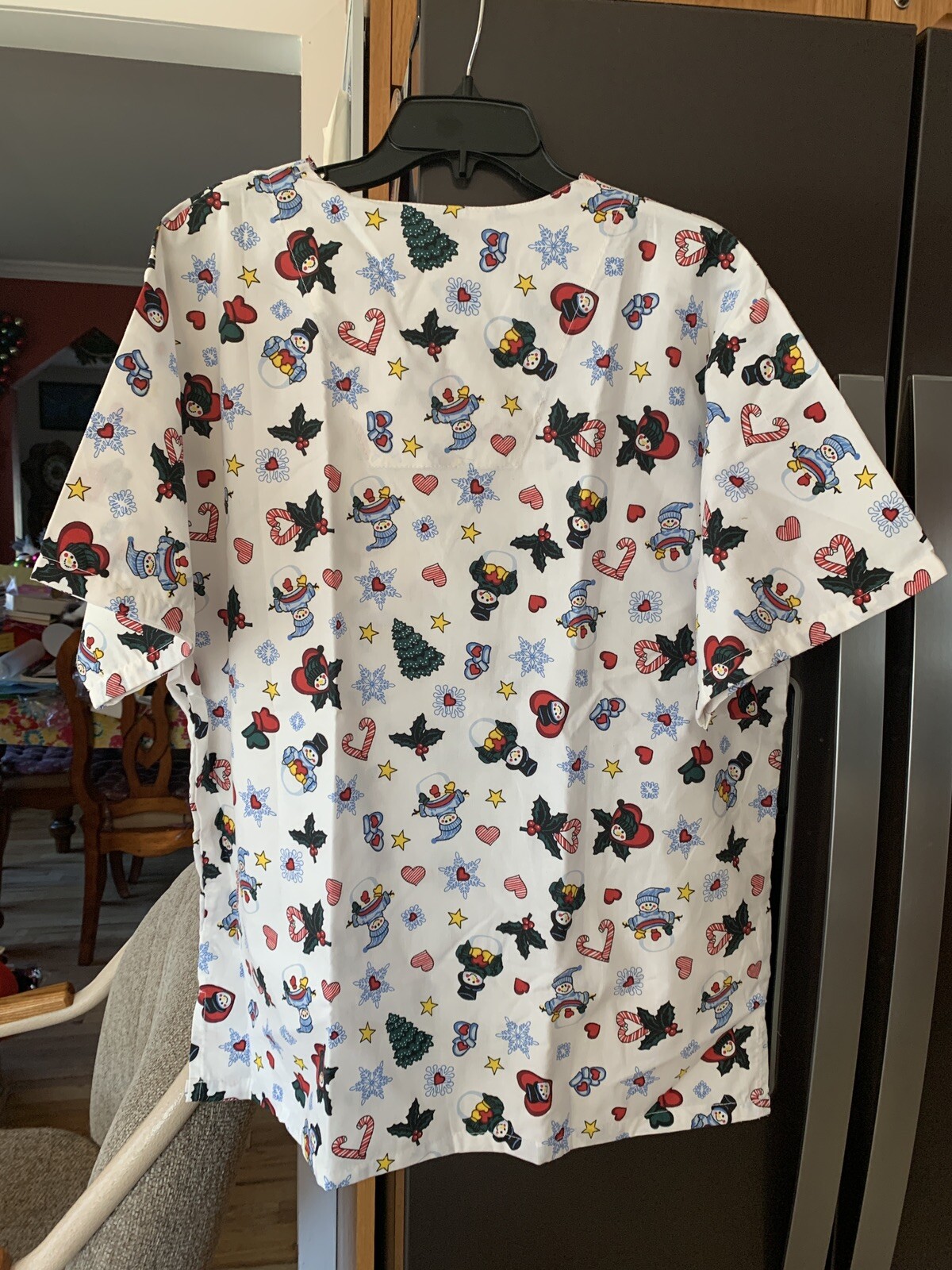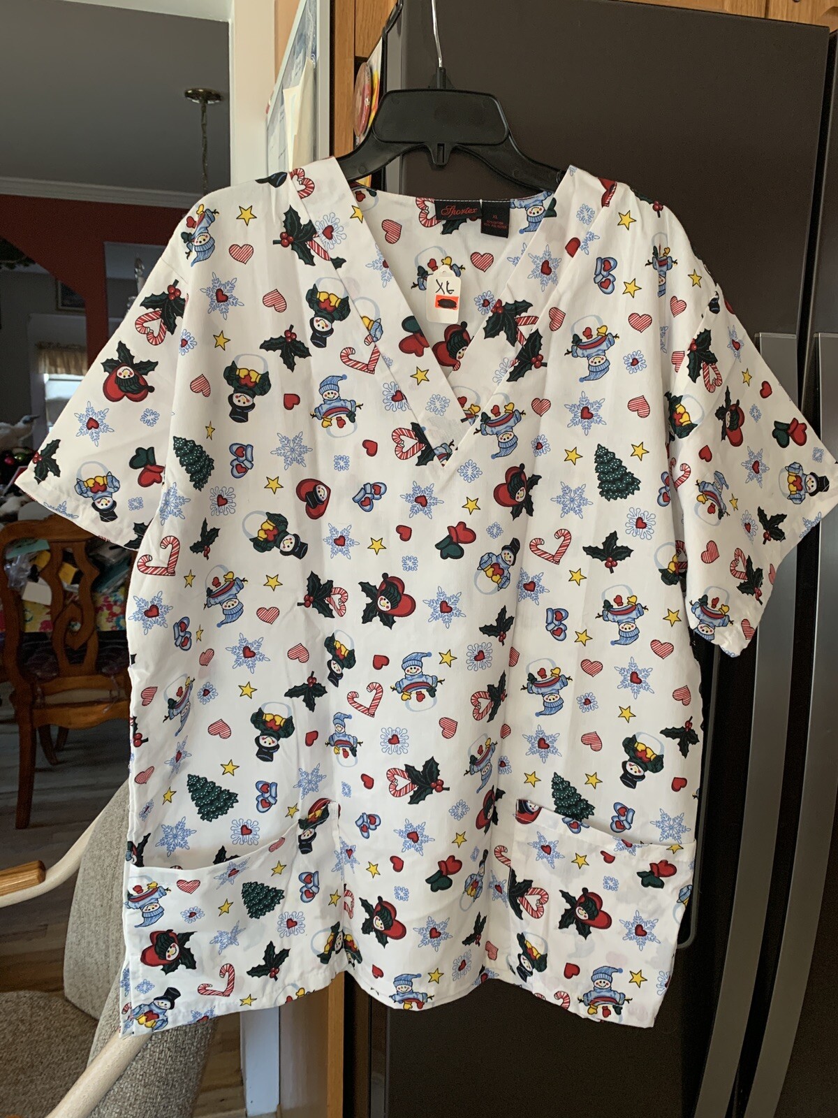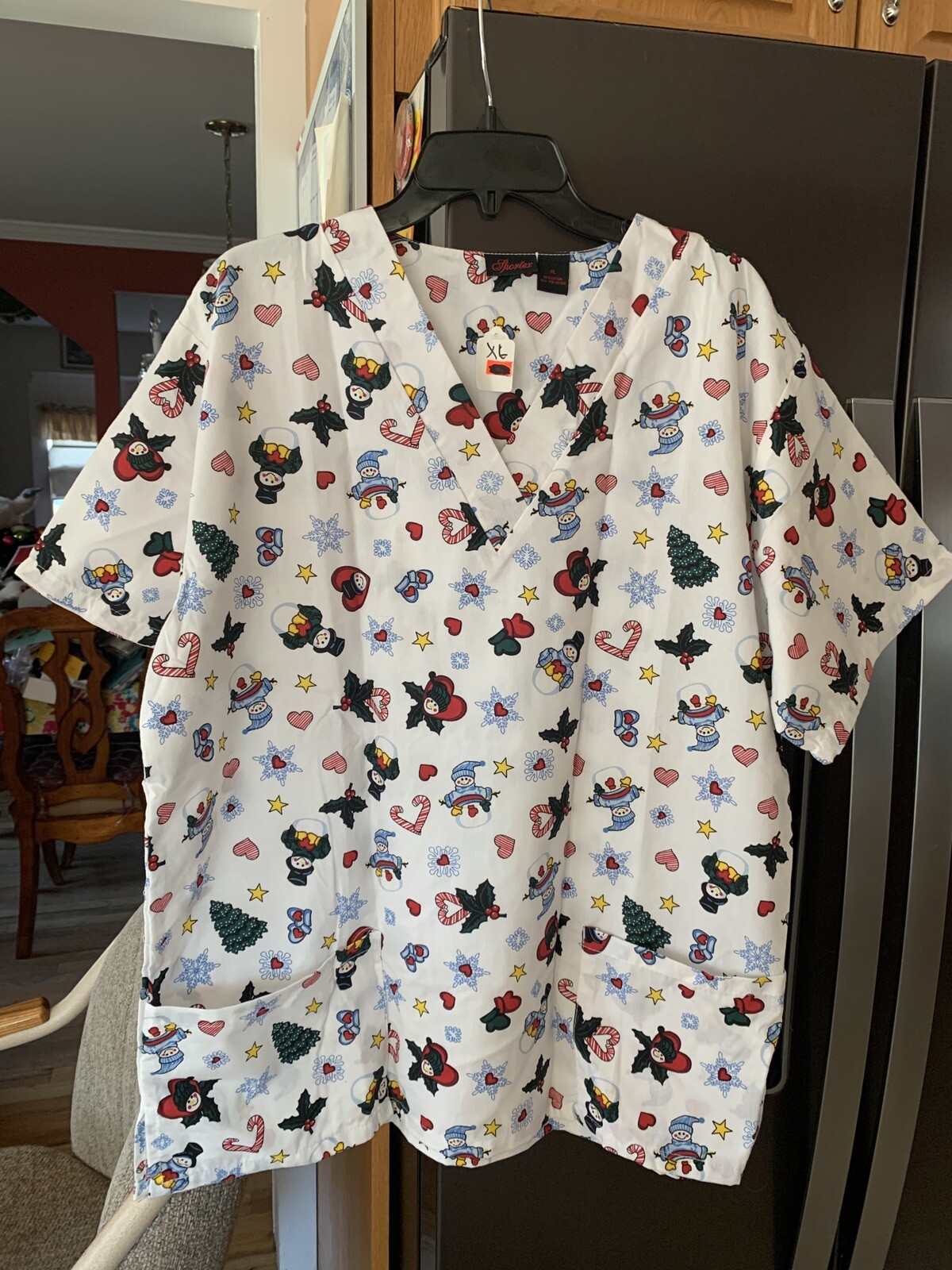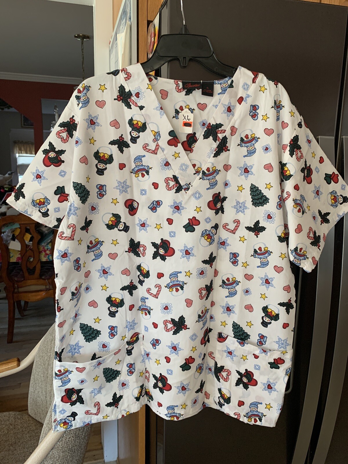 как выглядит Holiday Snowmen Heart Holly Berry Leaves Snowflakes Medical Scrub Top Pockets XL фото