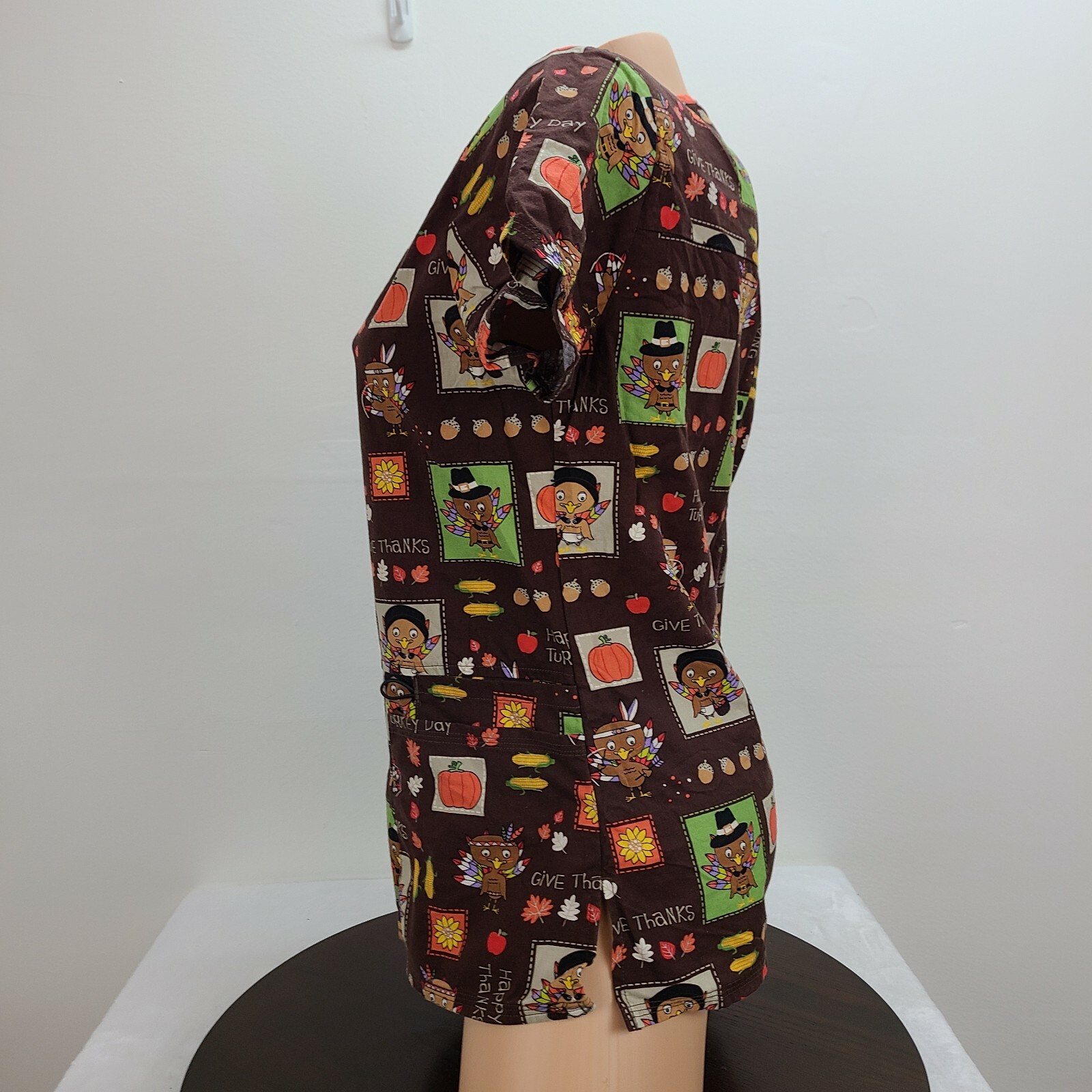 Scrubstar Scrub Top Women Extra Small Thanksgiving Turkey Brown Pockets XS