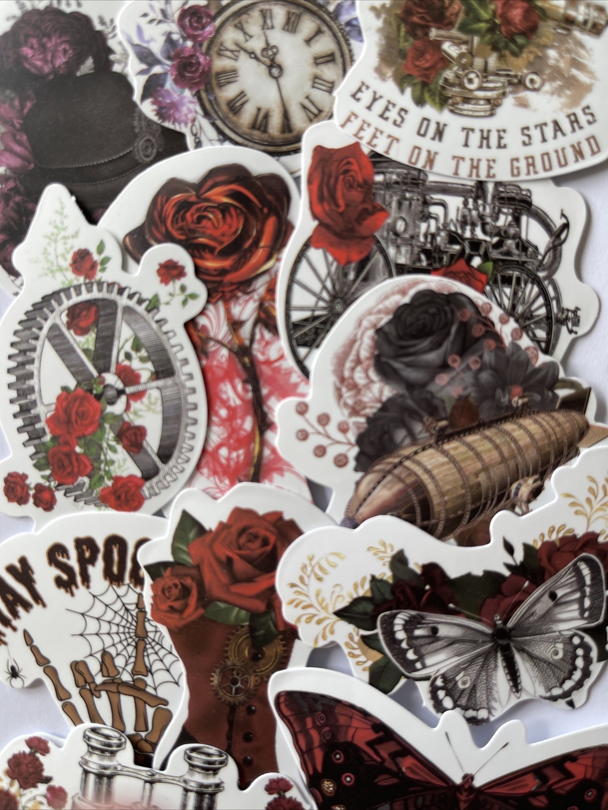 VICTORIAN ASSORTMENT Stickers 6pc Steampunk Skull Roses Clock Flowers Gears