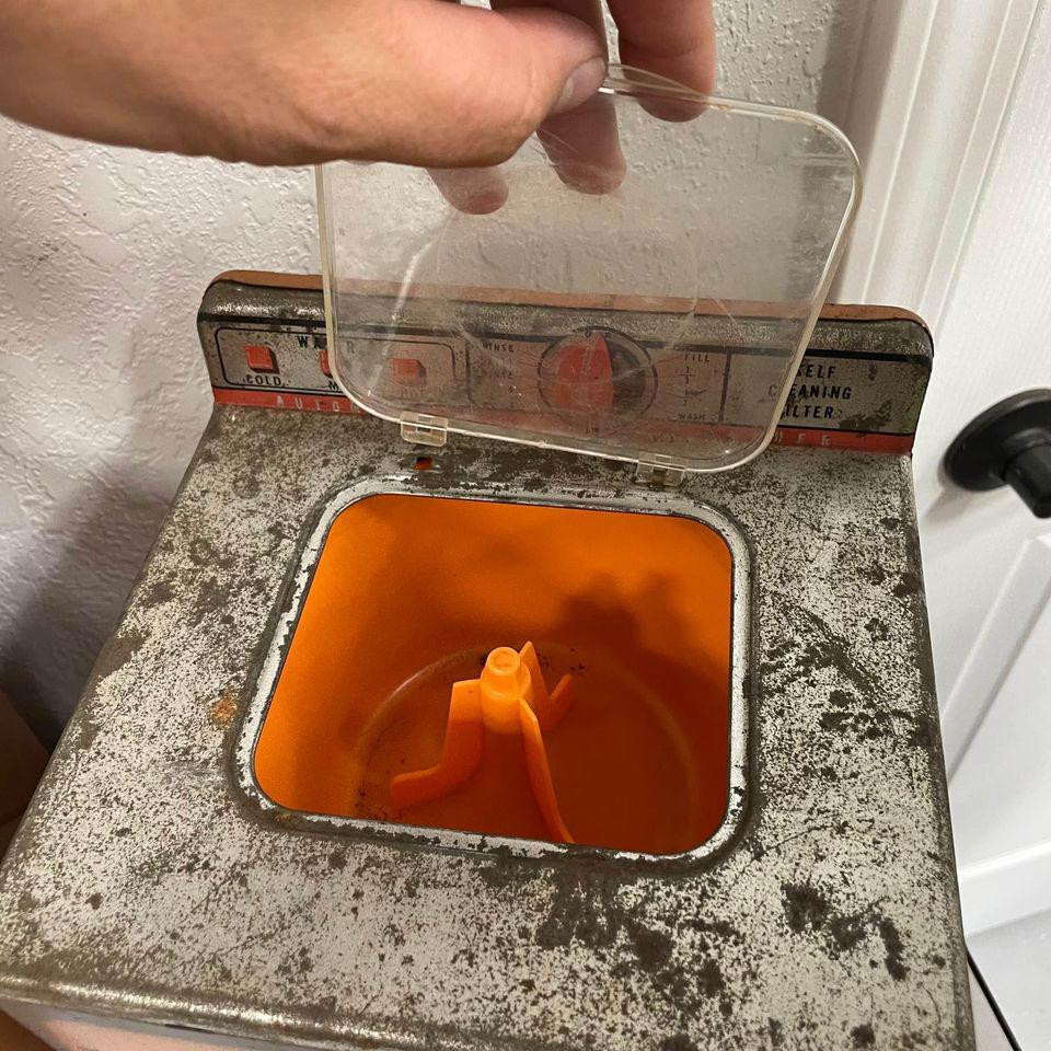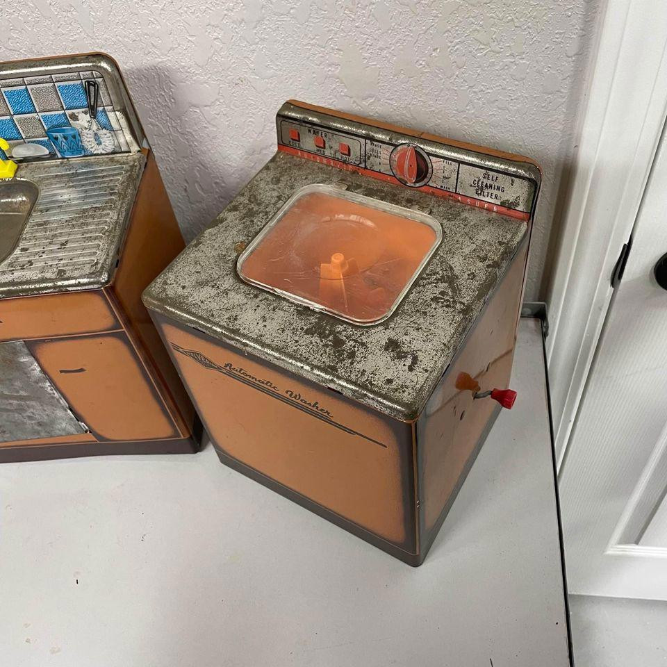 как выглядит 3 Vintage Wolverine Pink Toys Kitchen sink oven Stove Automatic Washer Tin - HLN фото
