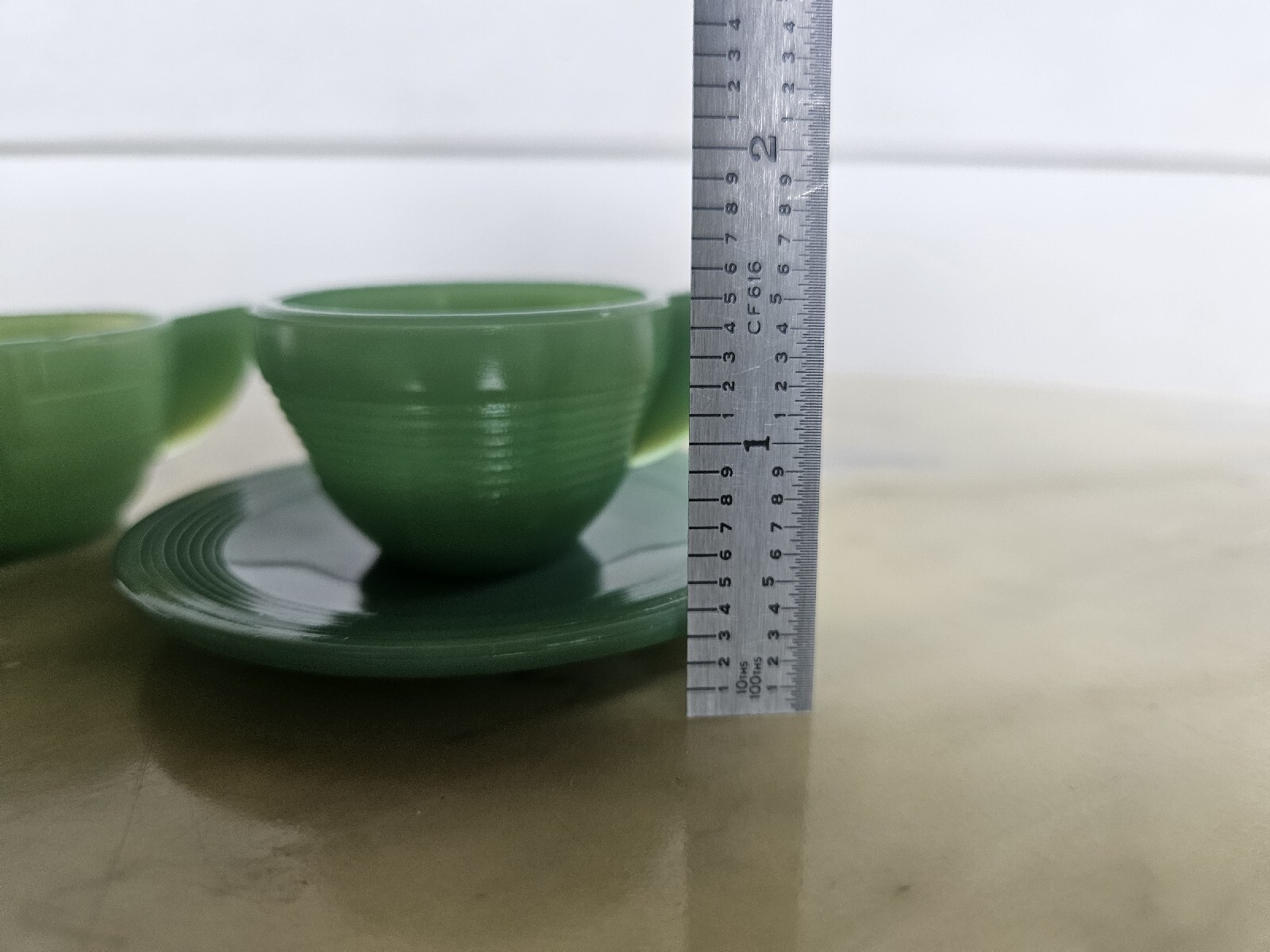 как выглядит Akro Agate Green Jadeite Childrens Art Deco Tea Cup Saucers Sugar Bowl Play Time фото