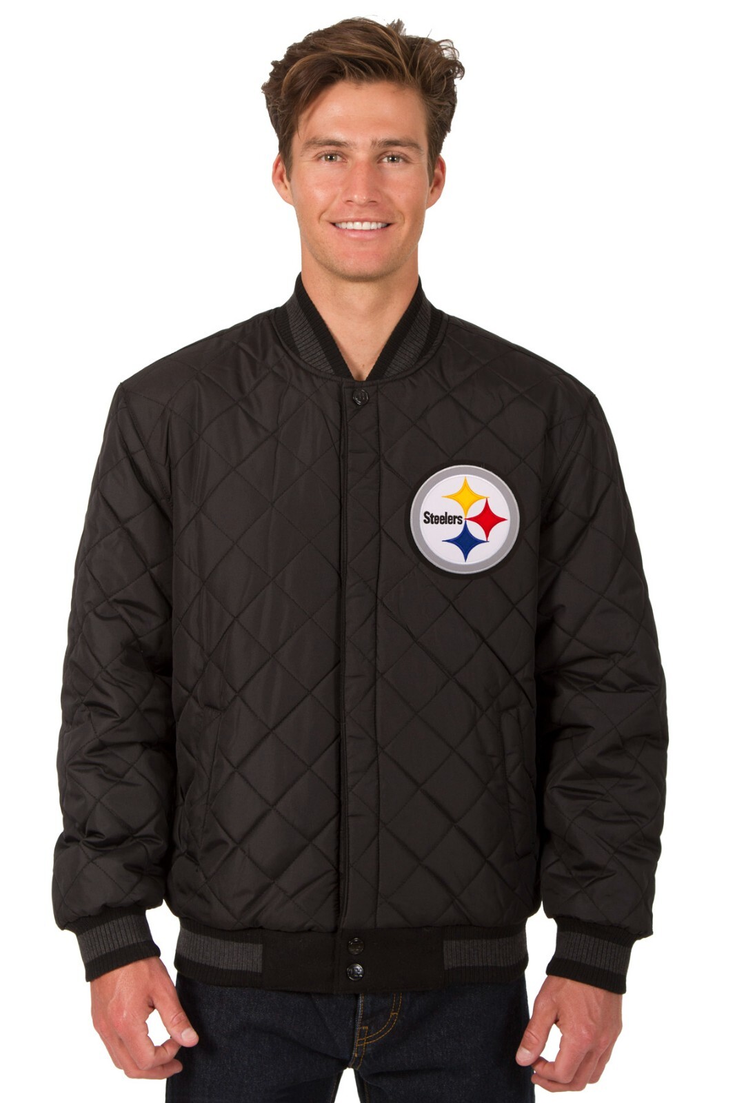 NFL Pittsburgh Steelers Wool Leather Reversible Jacket Front Patch Logos Black