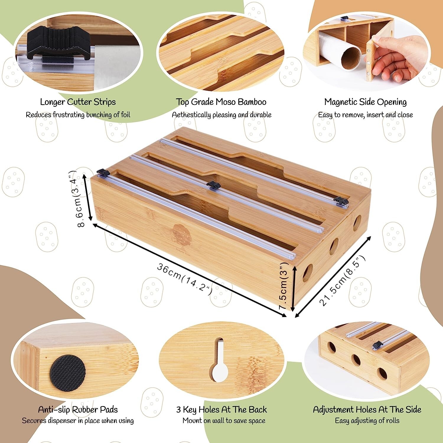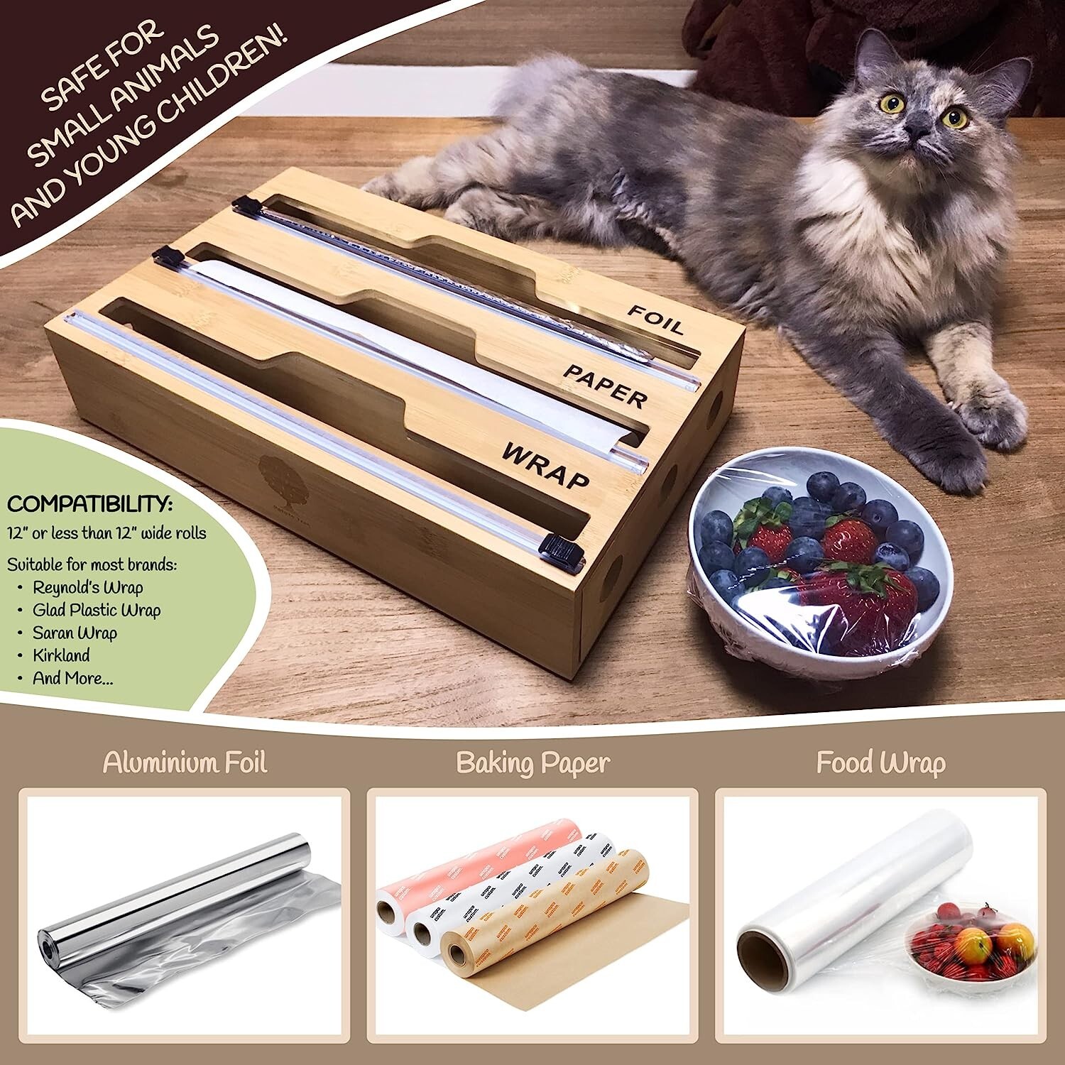 Aluminum Foil Plastic Wrap Wax Paper Dispenser w/ Cutter 3 in 1 Bamboo Kitchen