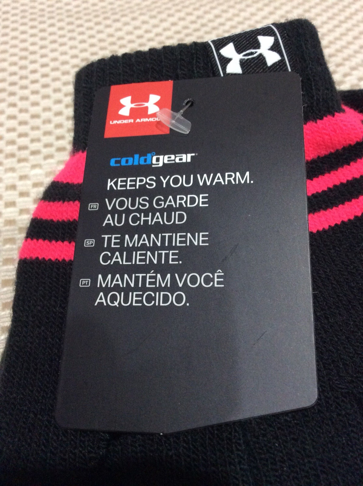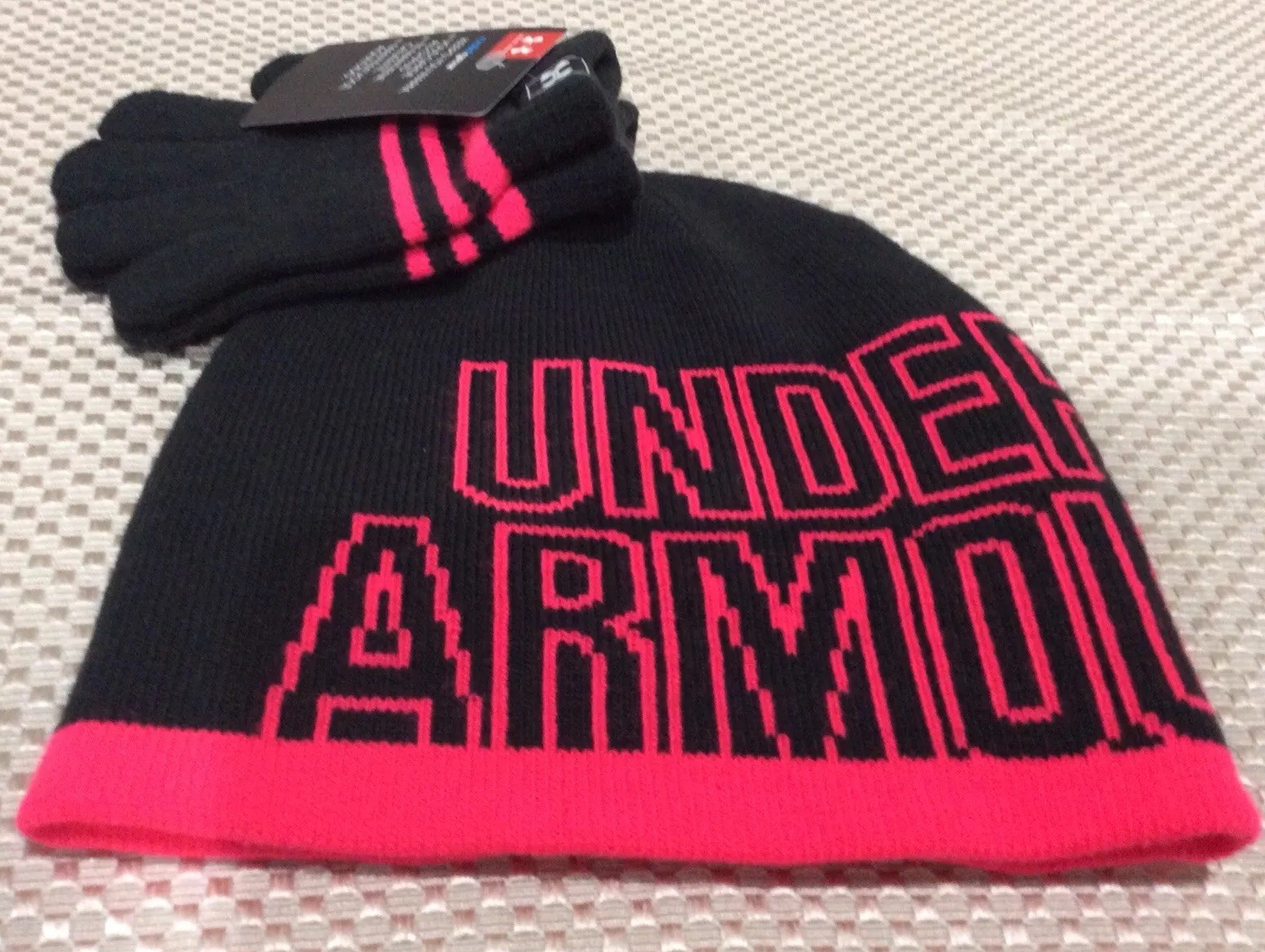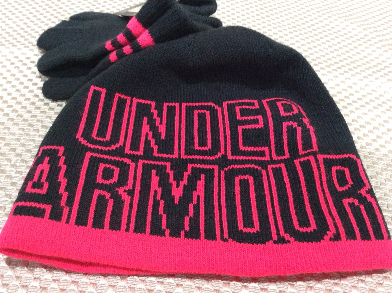 как выглядит Under Armour Little Girls Knit Beanie and Glove Combo, Black/Pink 4-6X Medium фото