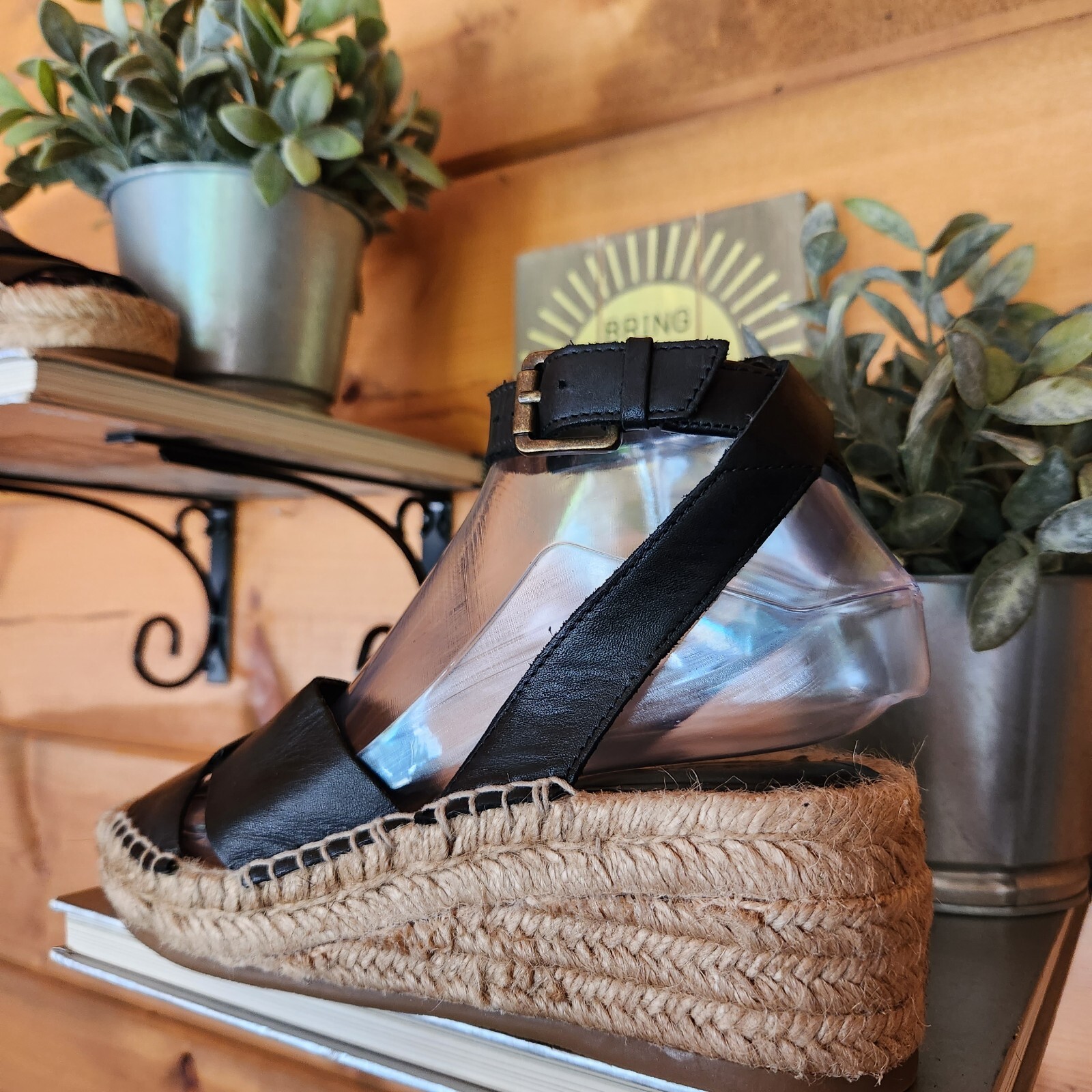 Nine West Edwisha Espadrilles Wedge Platform Sandals Black Leather Shoe Sz 6.5 M