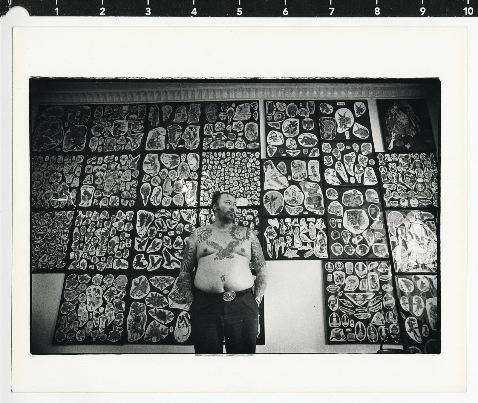 c. 1980's Tattooed Man in Front of Wall of Flash Art in Tattoo Studio Photograph
