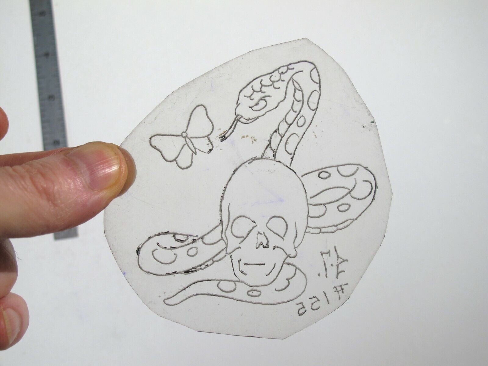как выглядит vtg 1960s 70s Tattoo Flash acetate stencil Skull Snake Butterfly signed SN3 фото