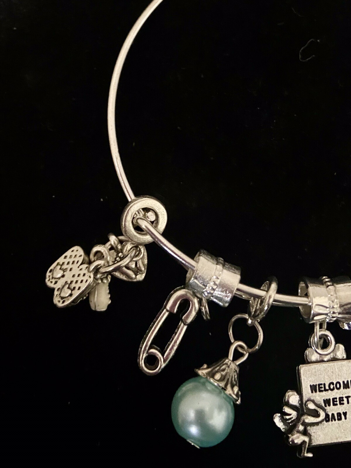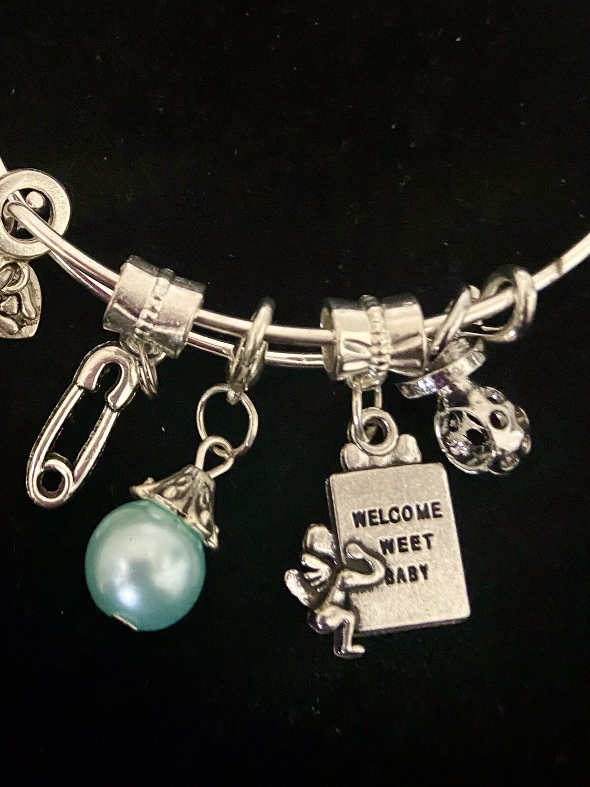 как выглядит It s A Boy Baby Shower Gift Silver Expandable Bangle Bracelet w/ Charms-0149 фото