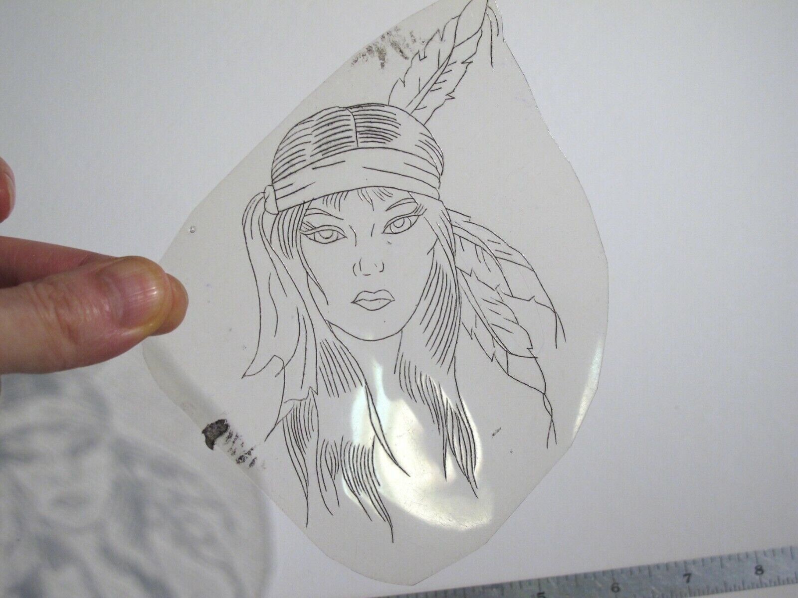 vtg 1960s 70s Tattoo Flash acetate stencil Native Am. Pinup girl WMN4