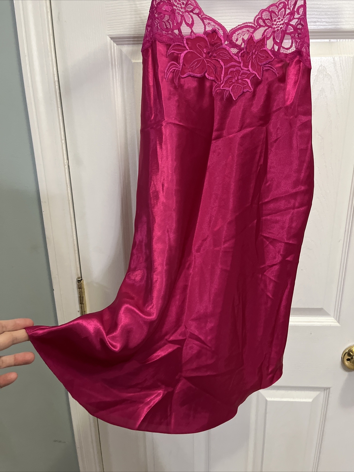 как выглядит SATIN SLIP DRESS LINGERIE by ERIKA TAYLOR Intimates sz M Fuchsia Lace фото