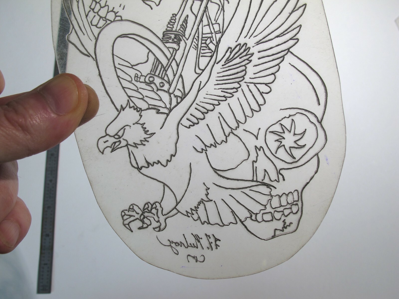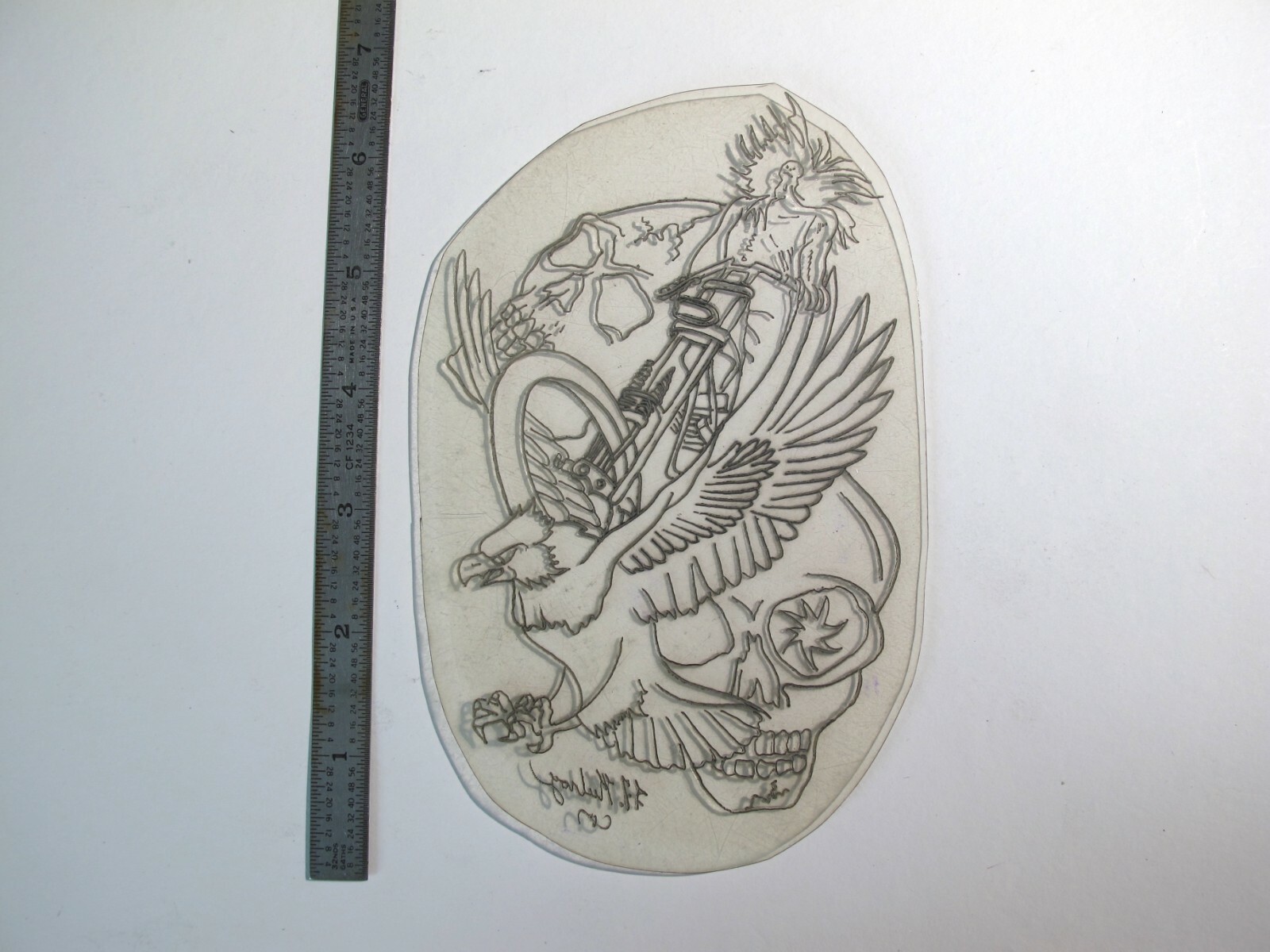 vtg 1960s 1970s Tattoo acetate stencil Biker Skeleton Skulls and Eagle LG signed