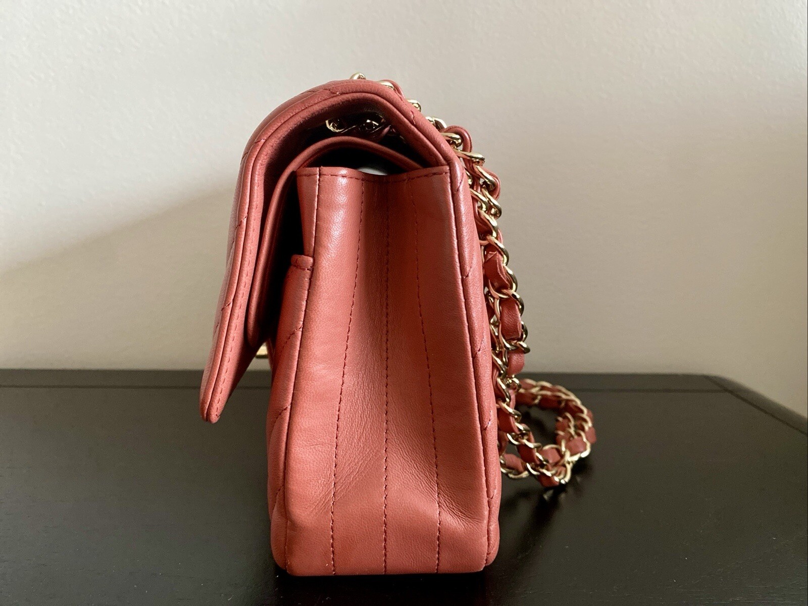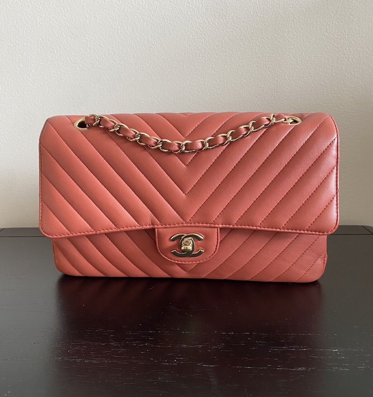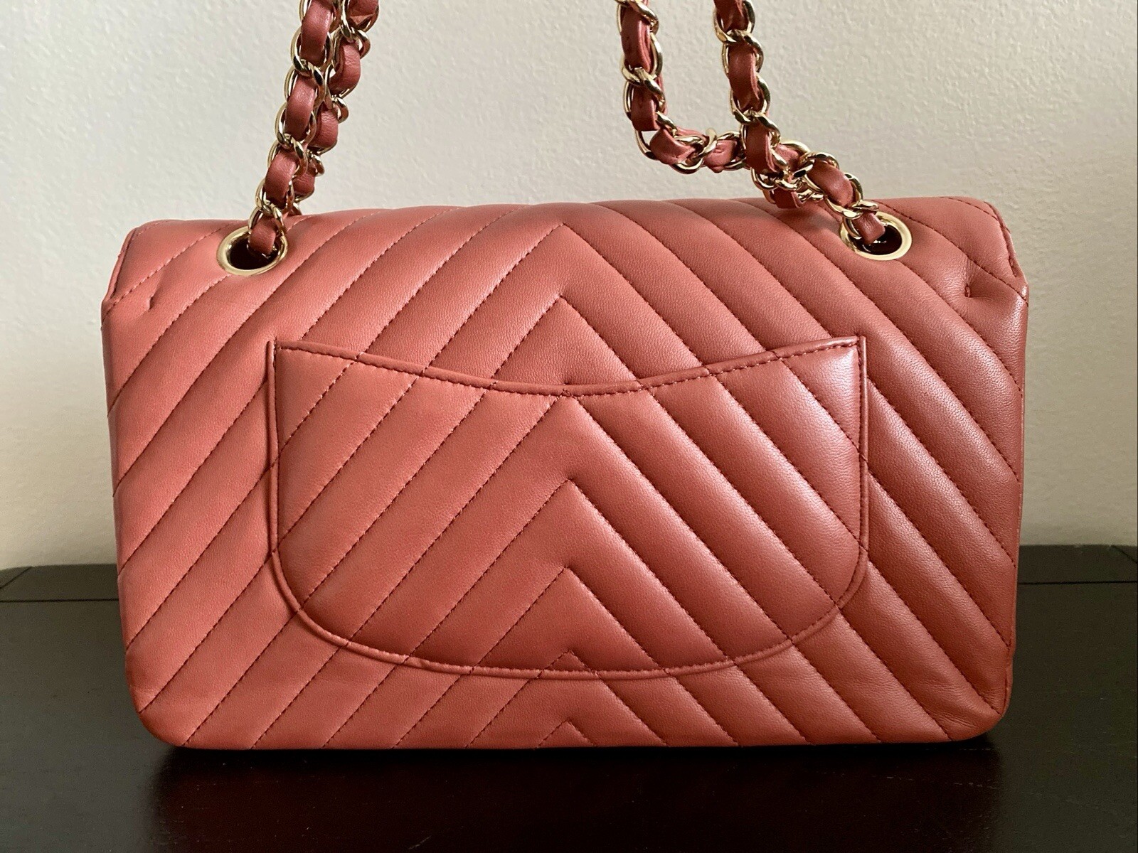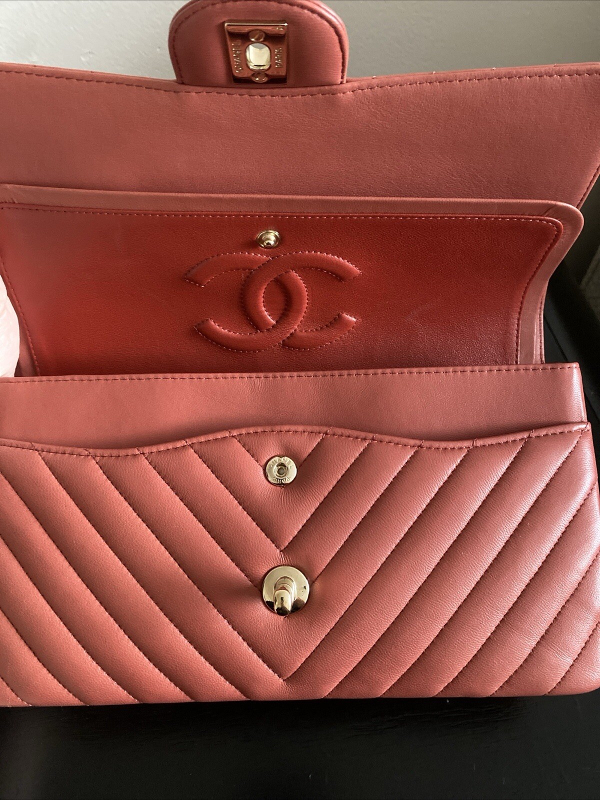Chanel Classic Double Flap Medium Pink Chevron Lambskin Leather Handbag Gold GHW