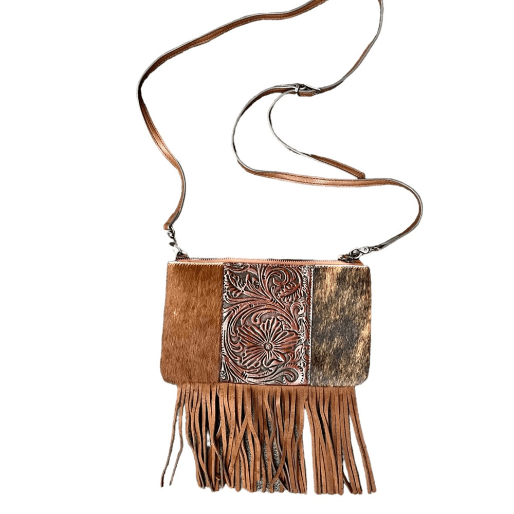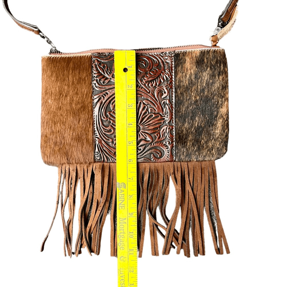 Leather/cowhide artisan made crossbody bag w/fringe, hand tooled details