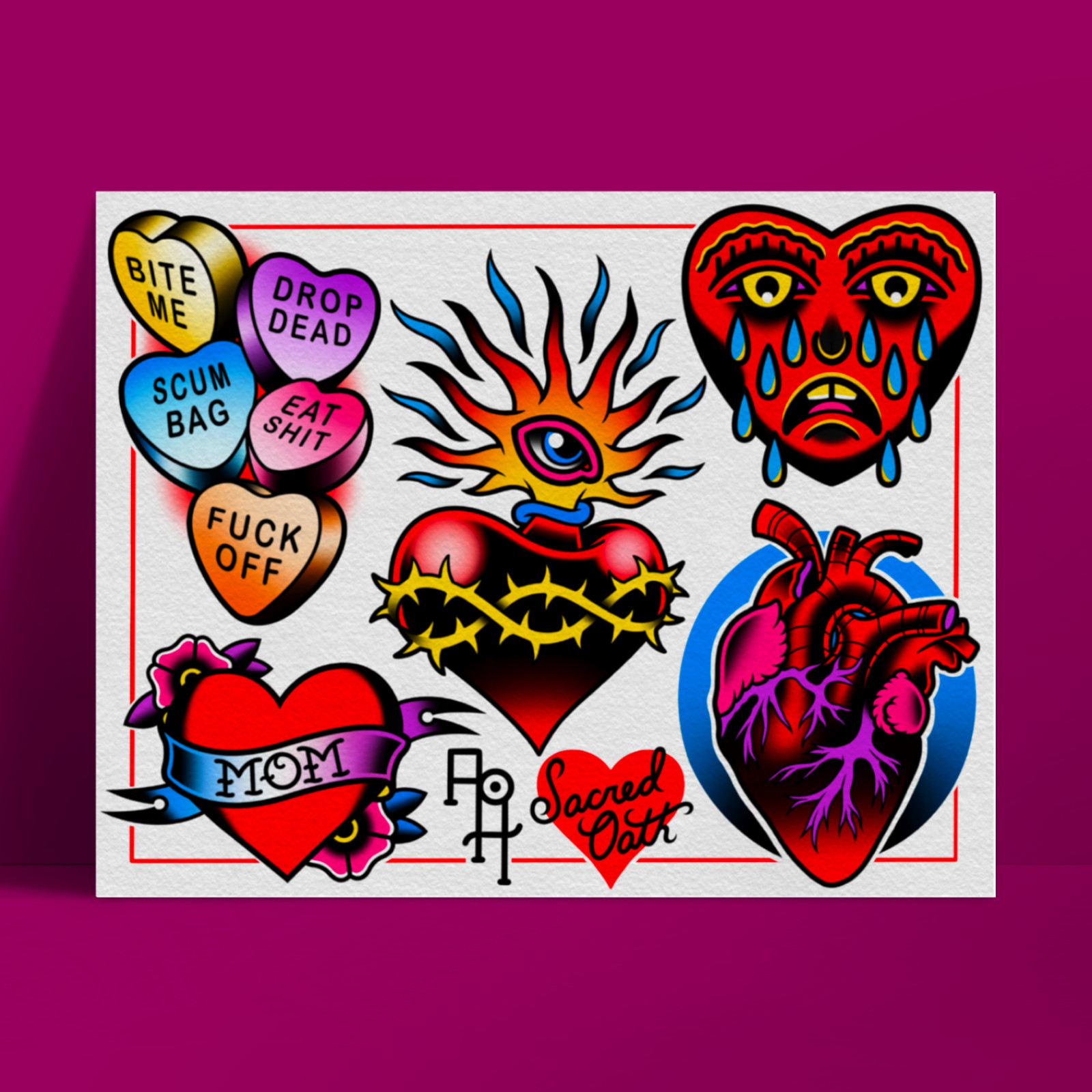 Hearts Neo-Traditional Tattoo Flash Art Print 11 x 14