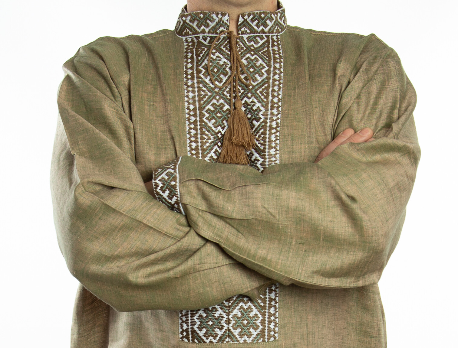как выглядит Military Vyshyvanka Mens Ukraine hand Embroidery LINEN khaky beige Satin stitch фото