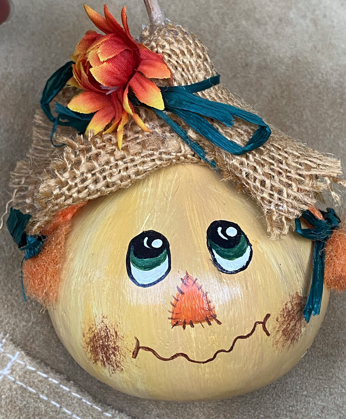 • Handpainted Gourd Small Smiling Scarecrow Autumn Fall Halloween Decor Adorable