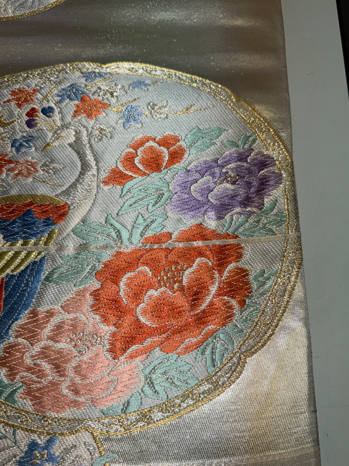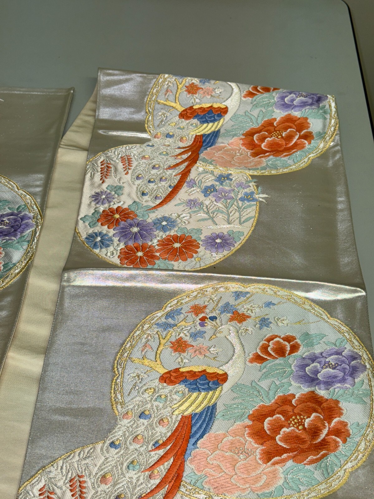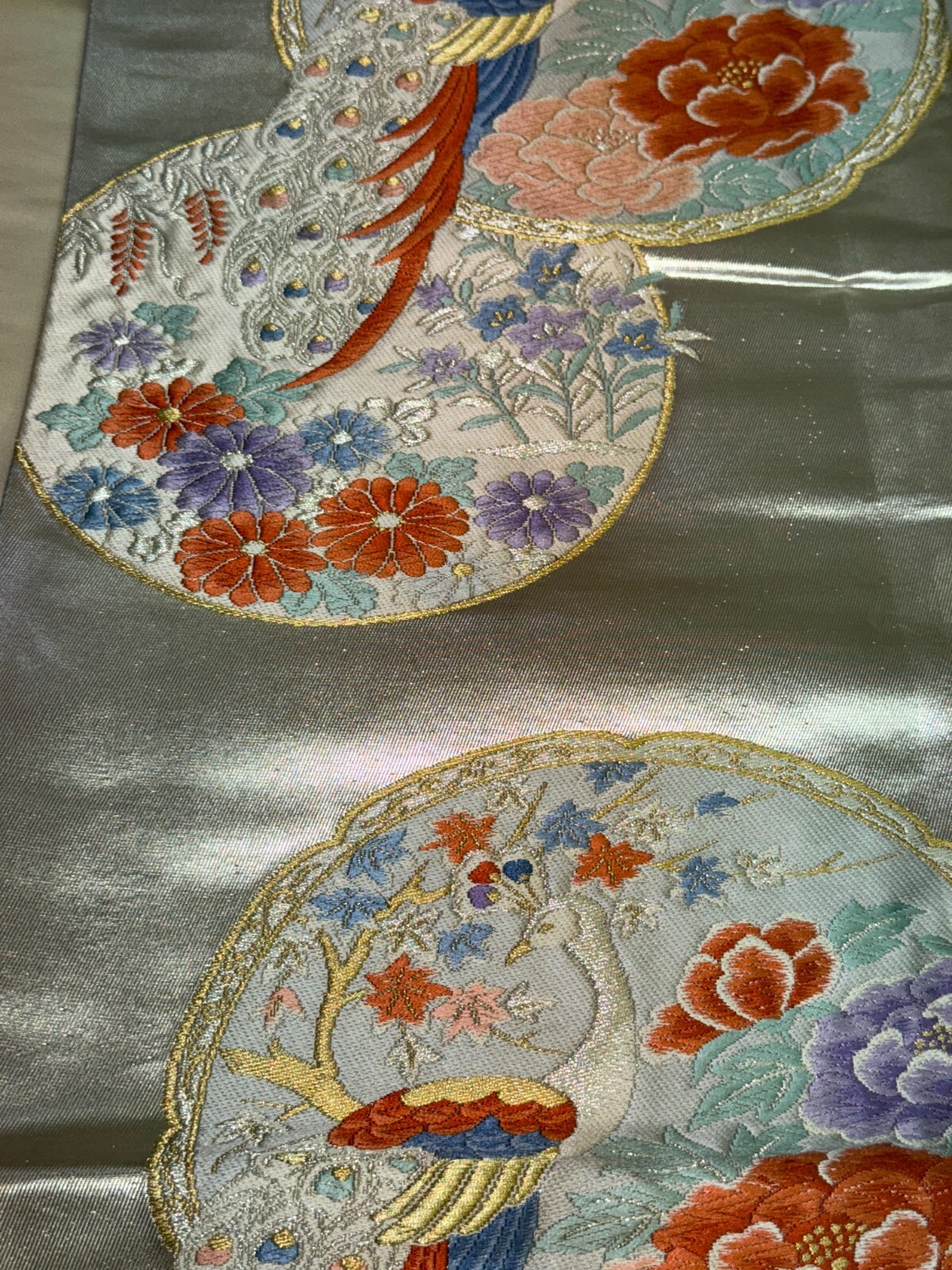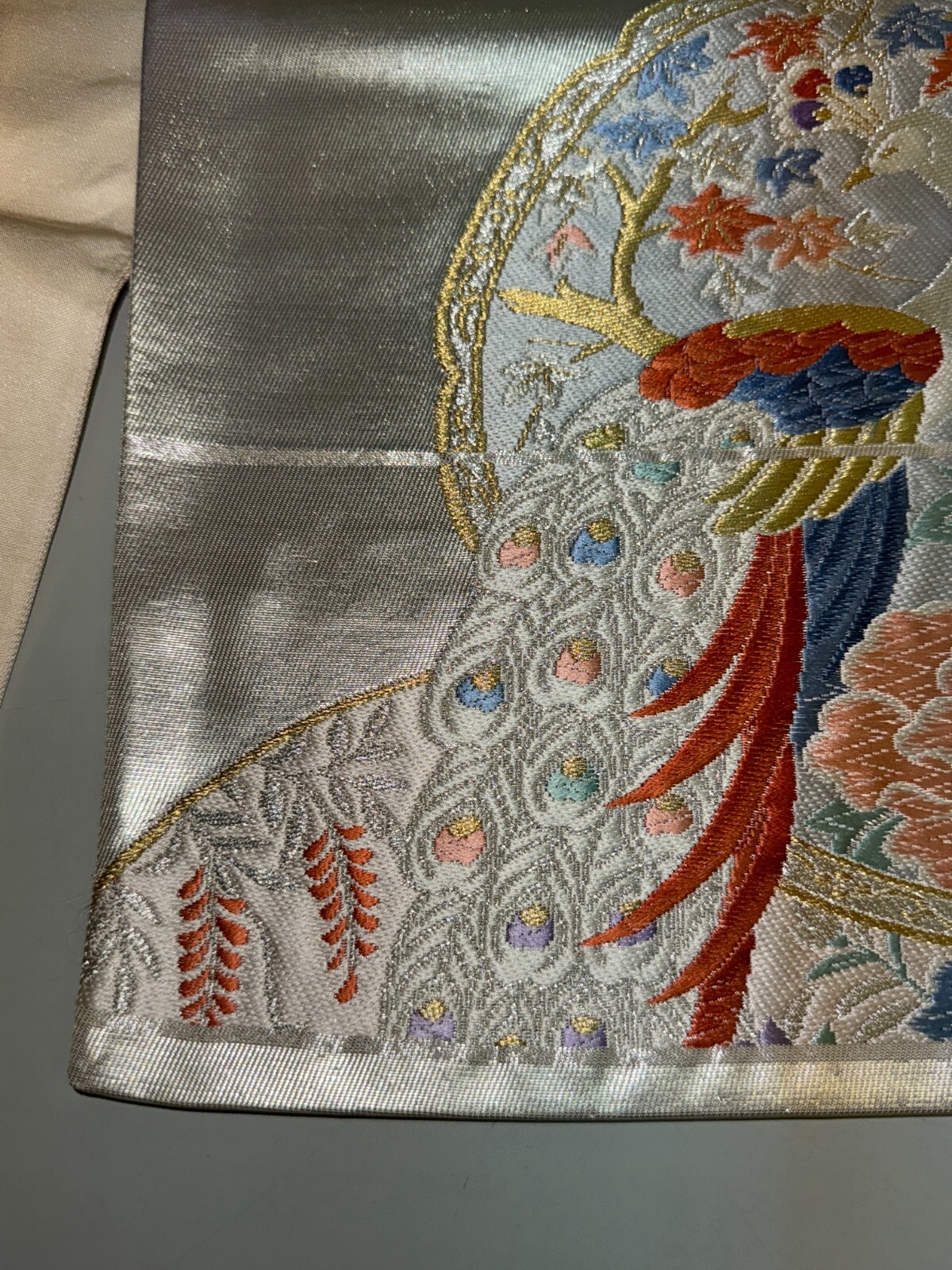 как выглядит Japanese Vintage Kimono Fukuro Obi silk Silver expensive Embroidery 167.7x12.2in фото