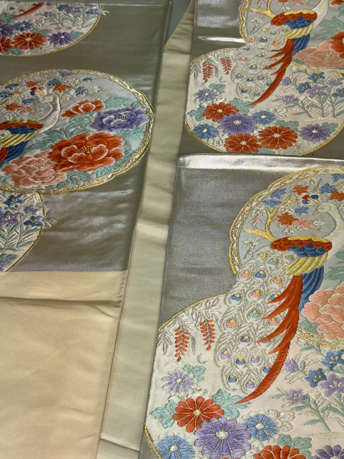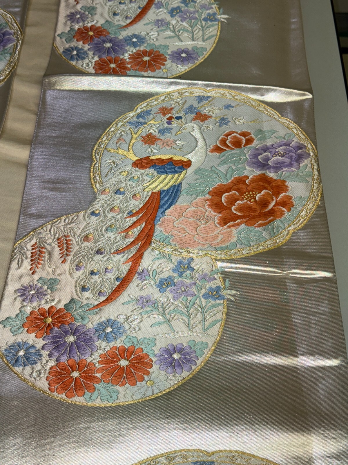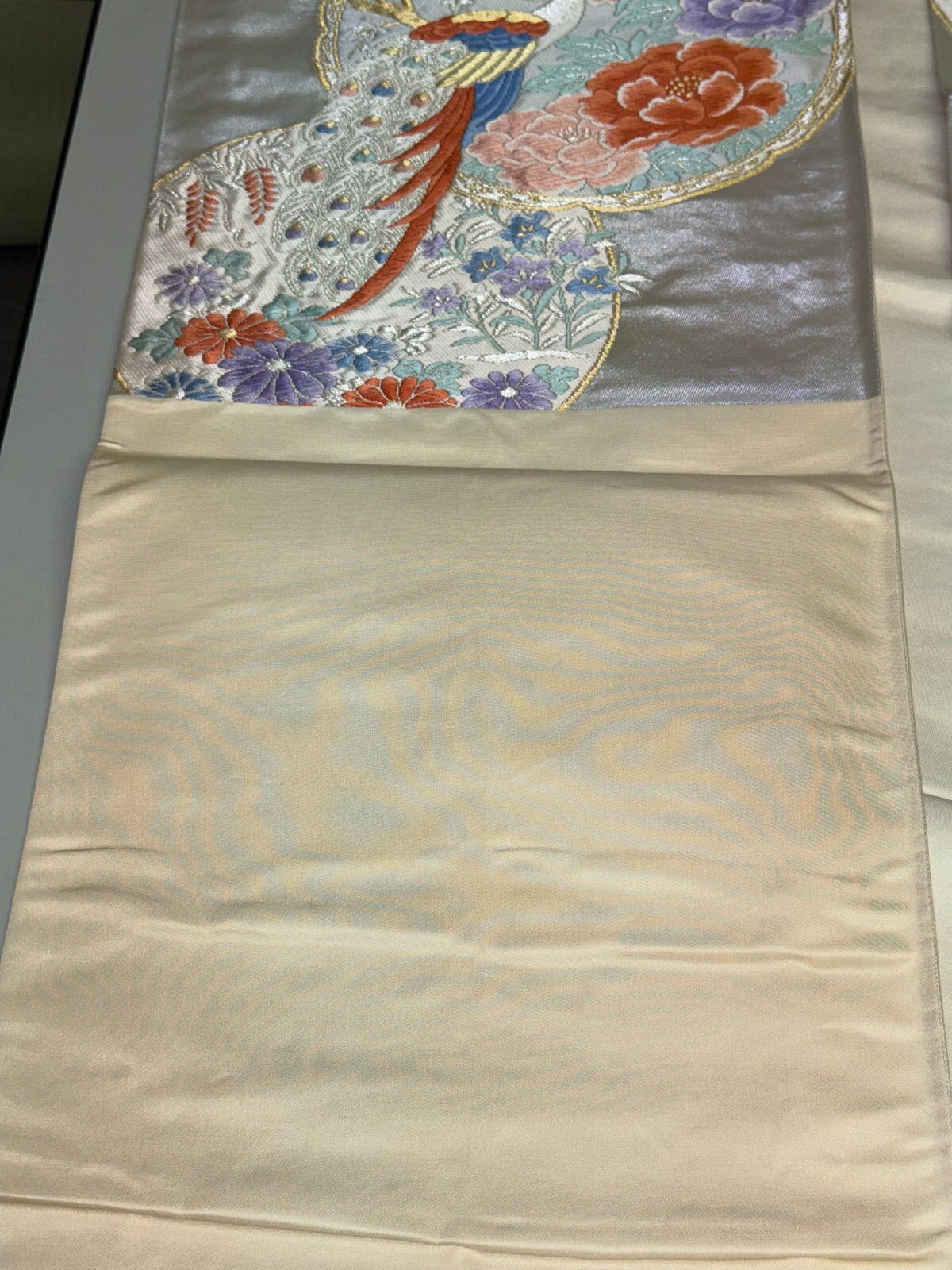 как выглядит Japanese Vintage Kimono Fukuro Obi silk Silver expensive Embroidery 167.7x12.2in фото