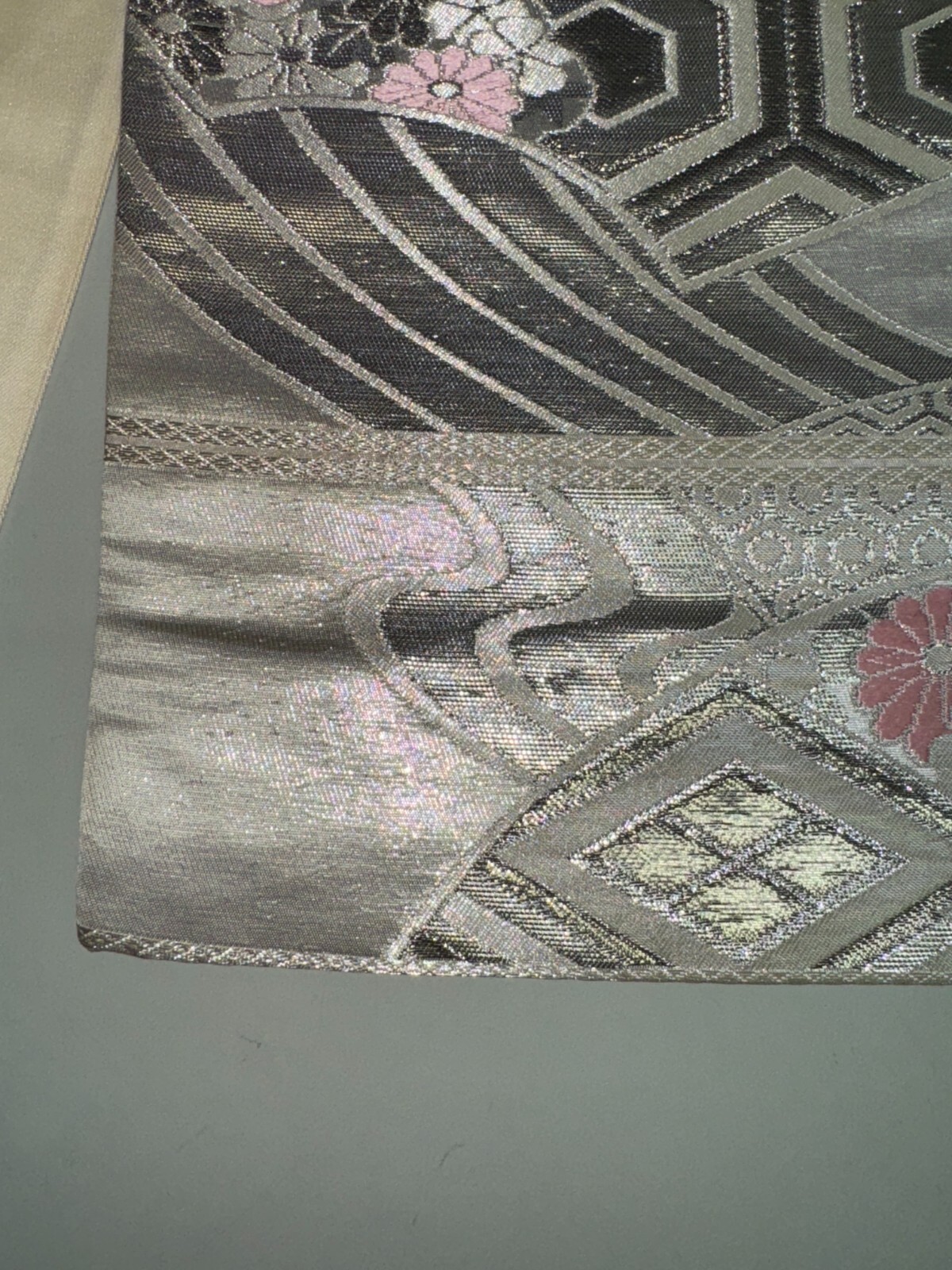 Japanese Vintage Kimono Fukuro Obi silk Silver expensive Embroidery 161.4x11.8in