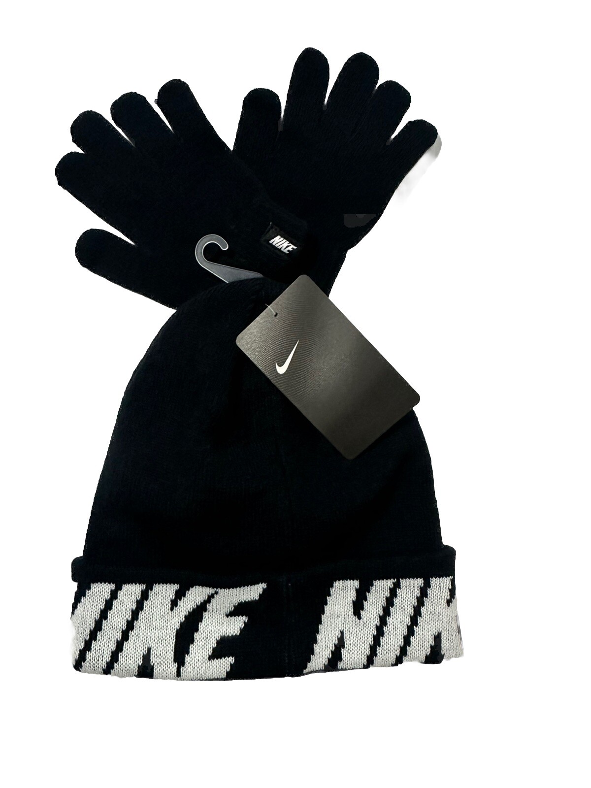 NIKE Boys Youth Black White Cuffed Knit Beanie Hat Gloves Set OS NWT
