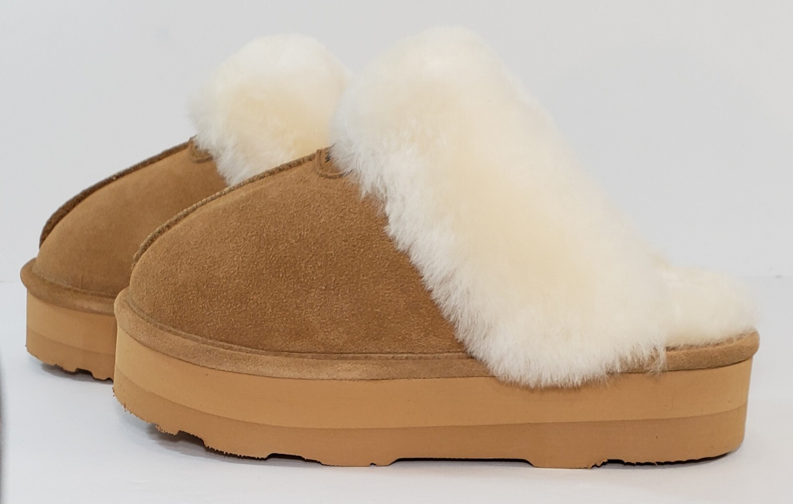 Bearpaw Platform Chunky Slippers, 9, Sheepskin, Tan Suede Leather WAS 80 NEW