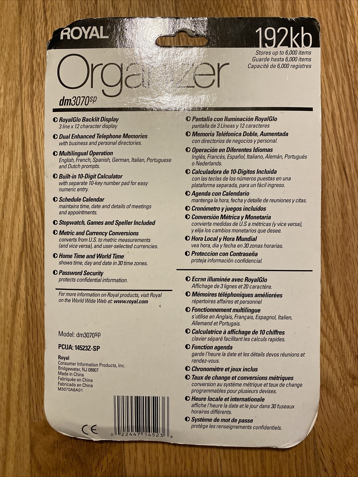 Особенности: Calculator, Calendar, Stopwatch, Games, Speller, Password Protection, Address Book, Scheduled Alarms, Local Time, World Time, Store up to 6,000 items, 192kb Memory