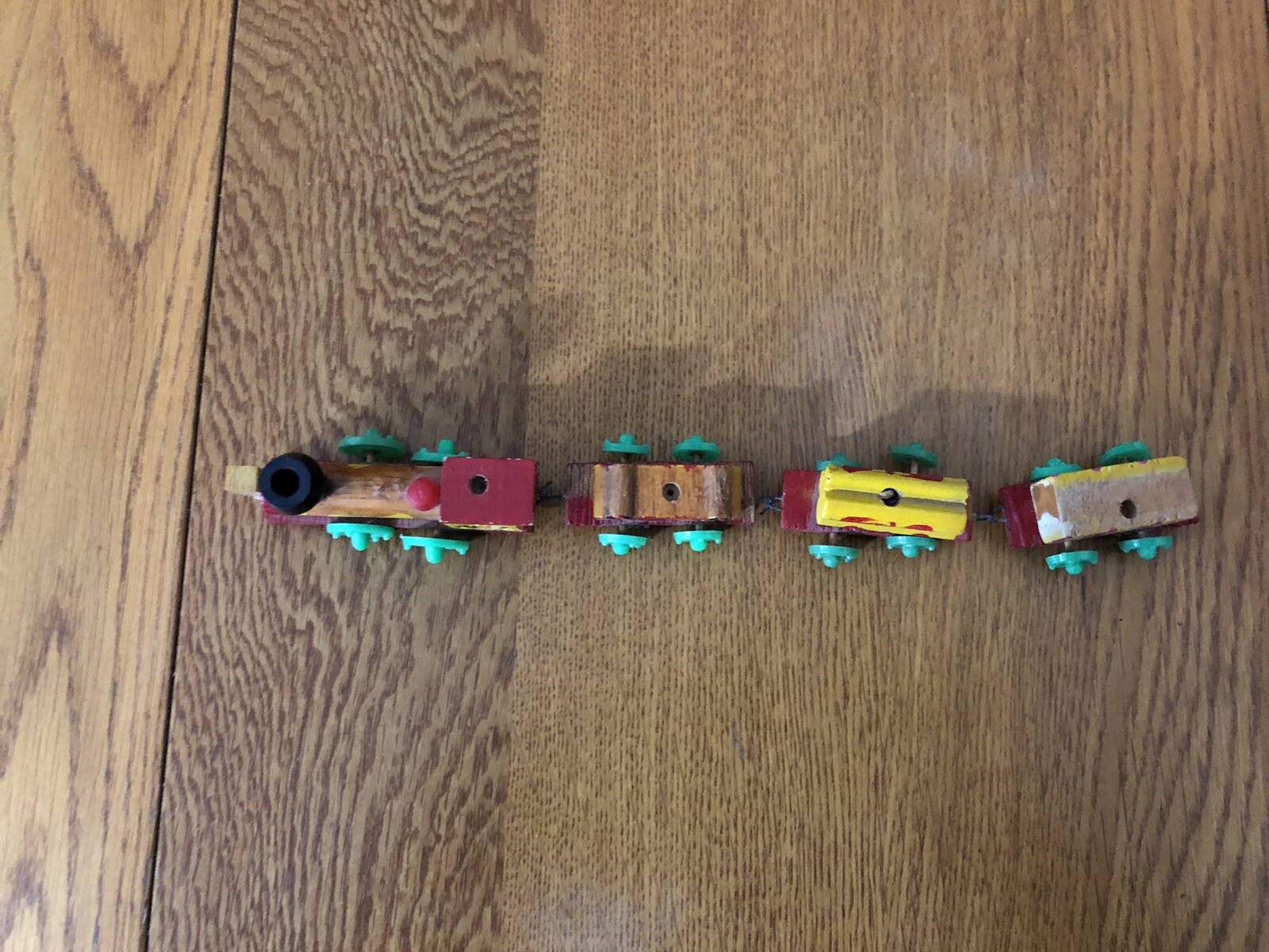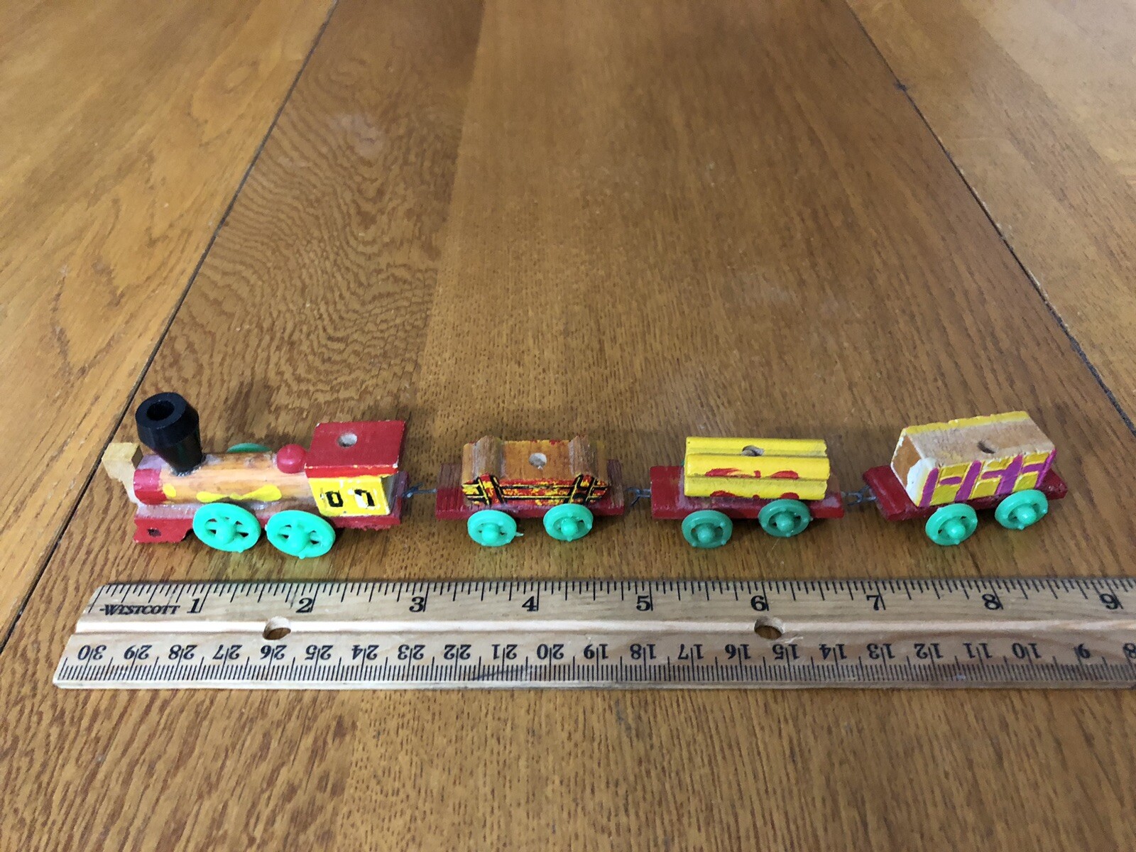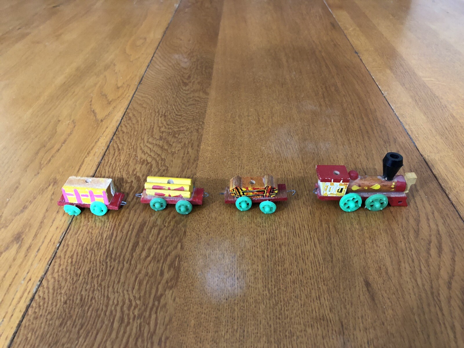 как выглядит VINTAGE MINIATURE WOODEN CONNECTING TRAIN ENGINE CABOOSE 2 CARS DECORATIVE TOY фото