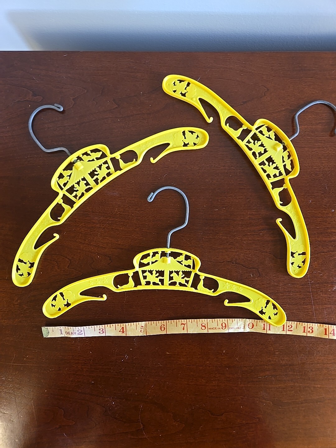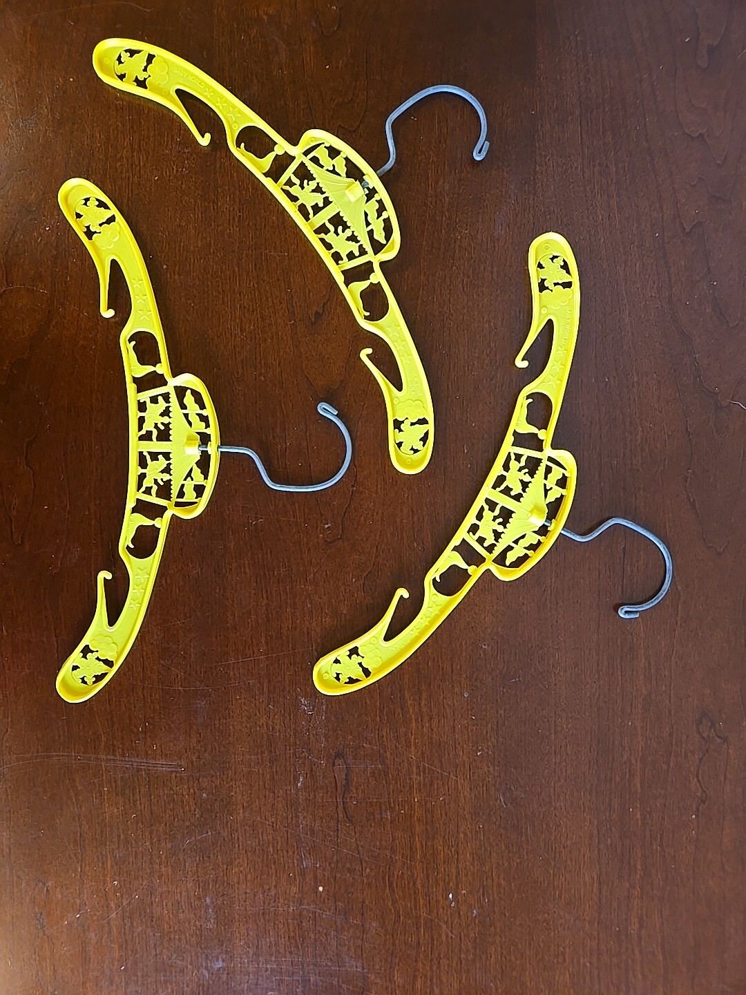как выглядит Set of 3 Baby Yellow Plastic Childs Clothes Hanger Vintage Carousel Clowns фото