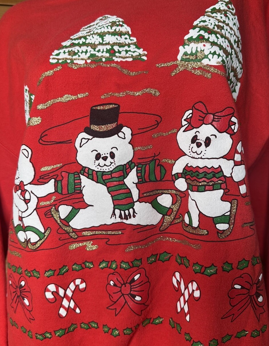 Vtg 90s Hanes Red Teddy Bear Christmas Tree Comfort Blend Sweater Sweatshirt L