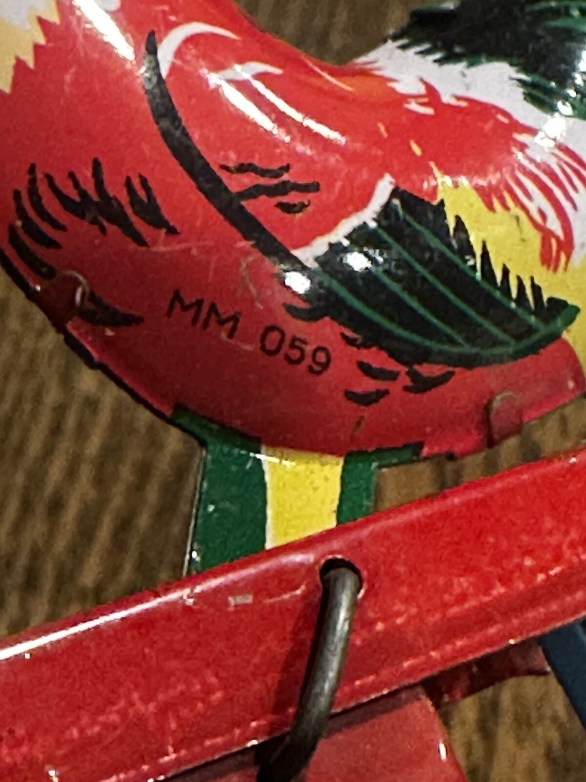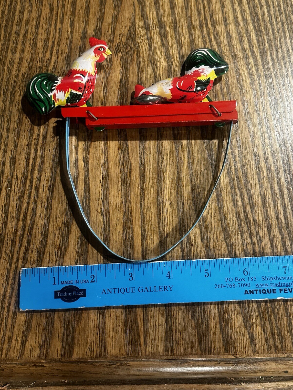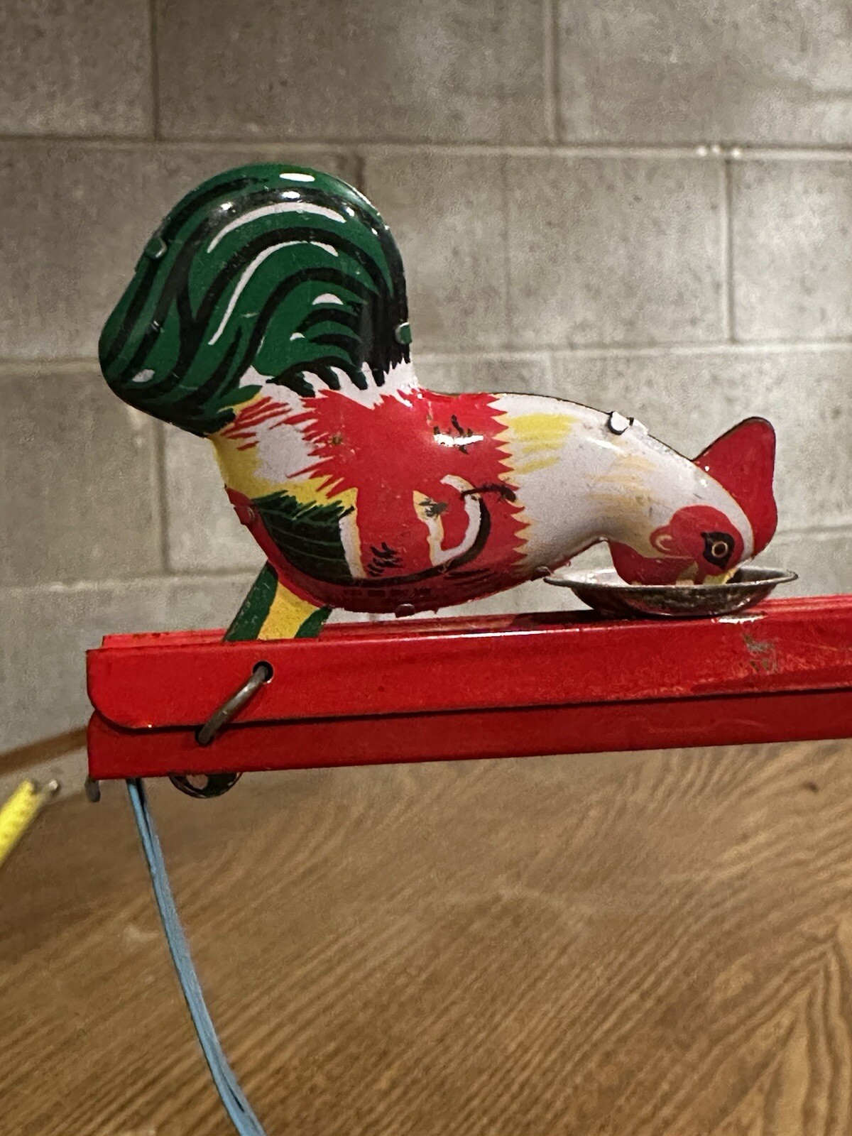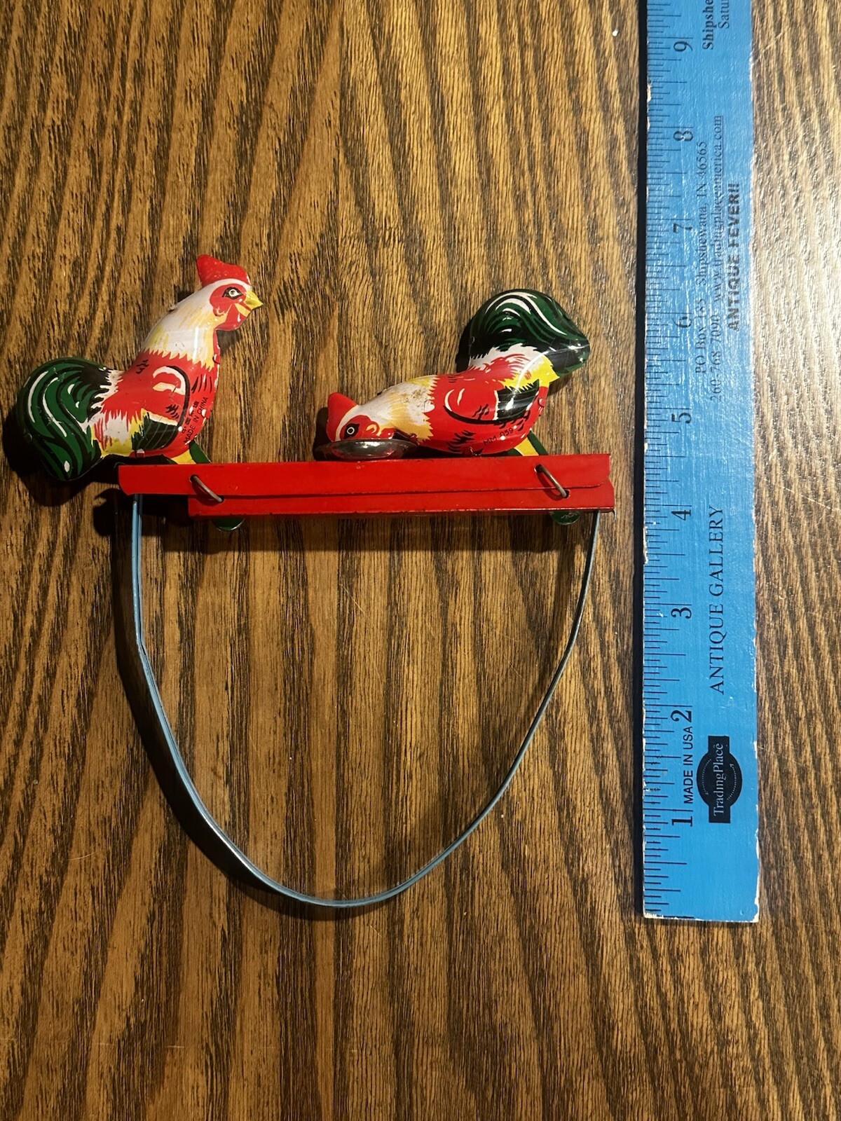 как выглядит Vintage Tin/Litho Metal Rooster/Chicken Pecking-Hand Squeeze Toy MM 059 фото