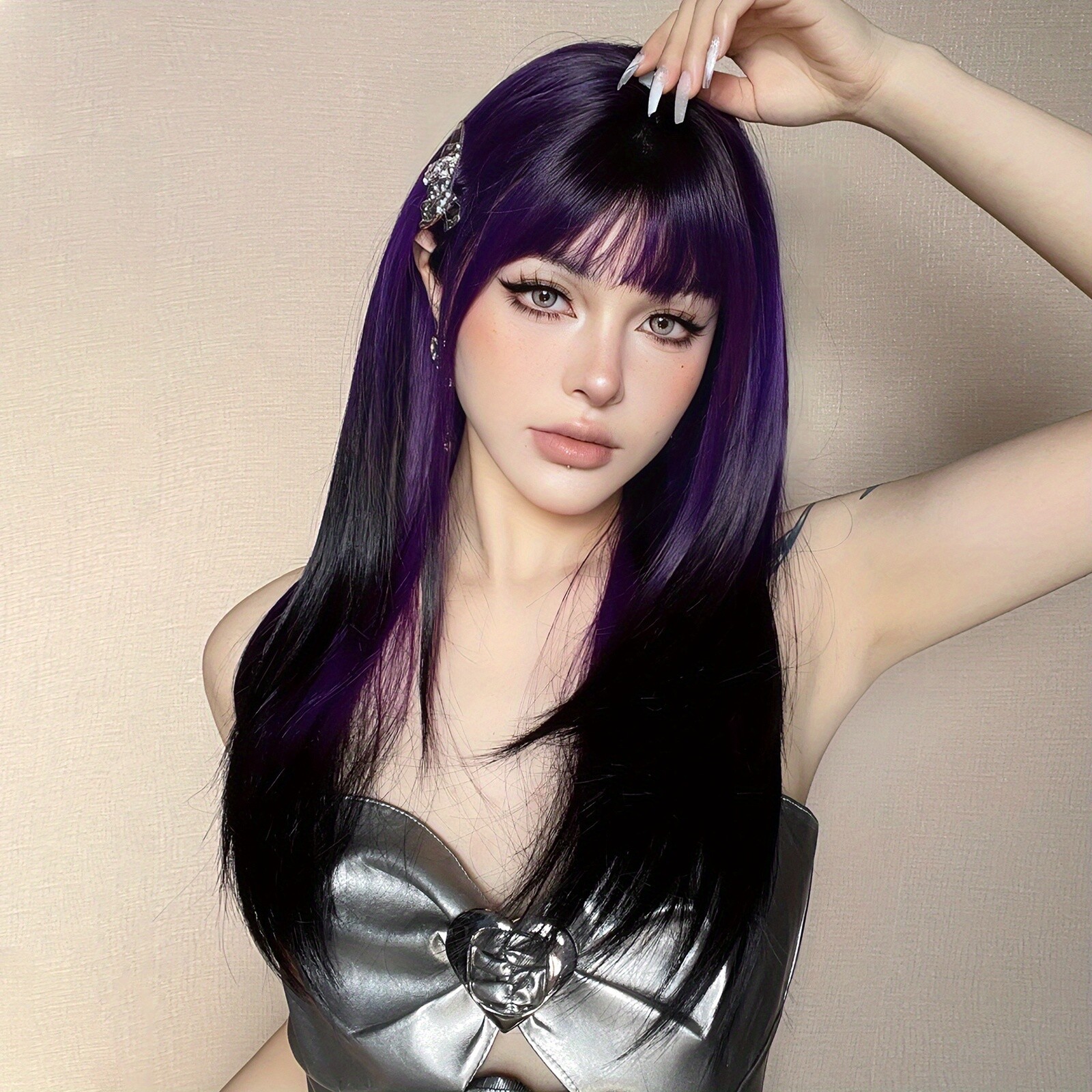 как выглядит 22 Inch Womens Long Straight Purple Fade To Black Synthetic Wig with Bangs фото