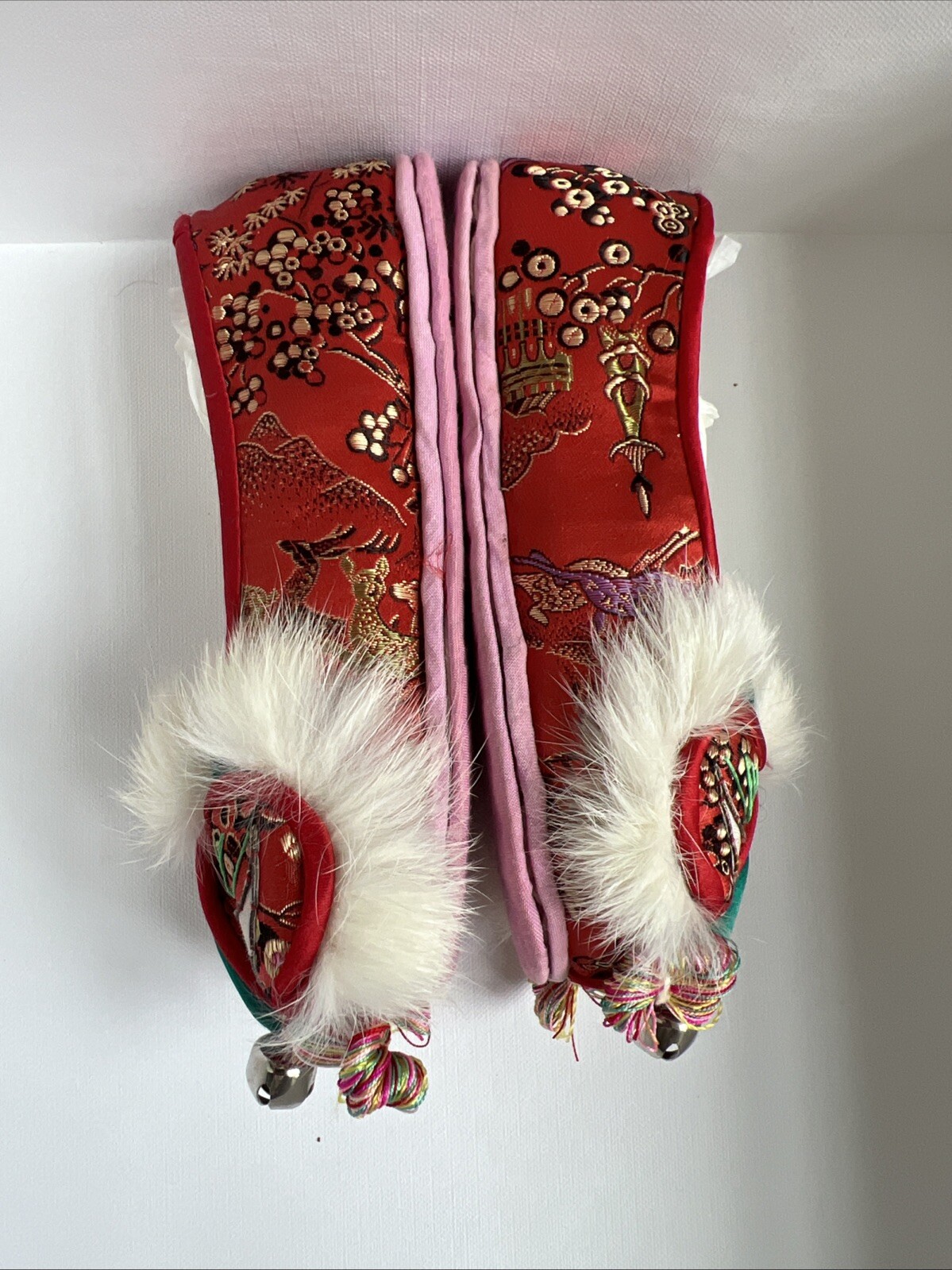 Vintage Pair Child Toddler Chinese Dragon Slippers Satin Fur Sz 6